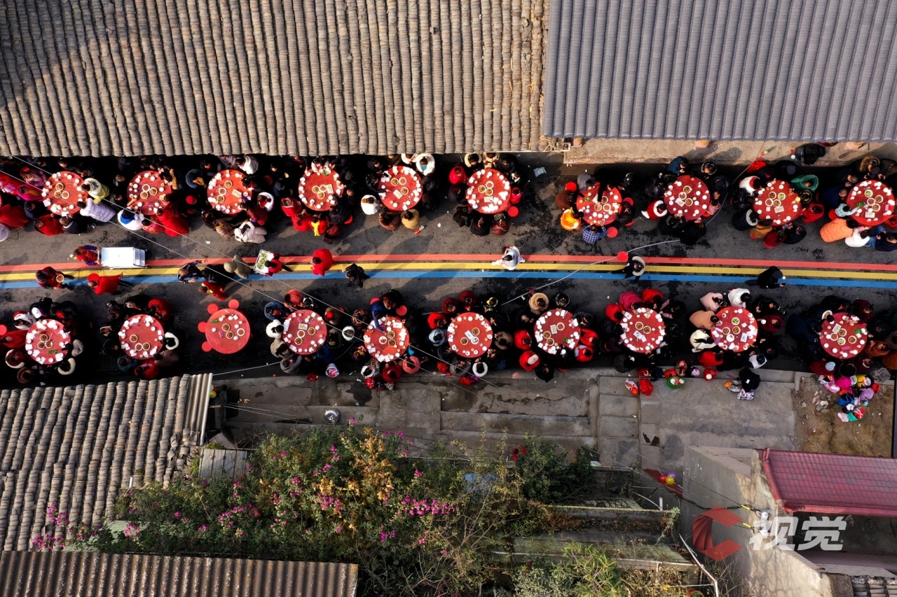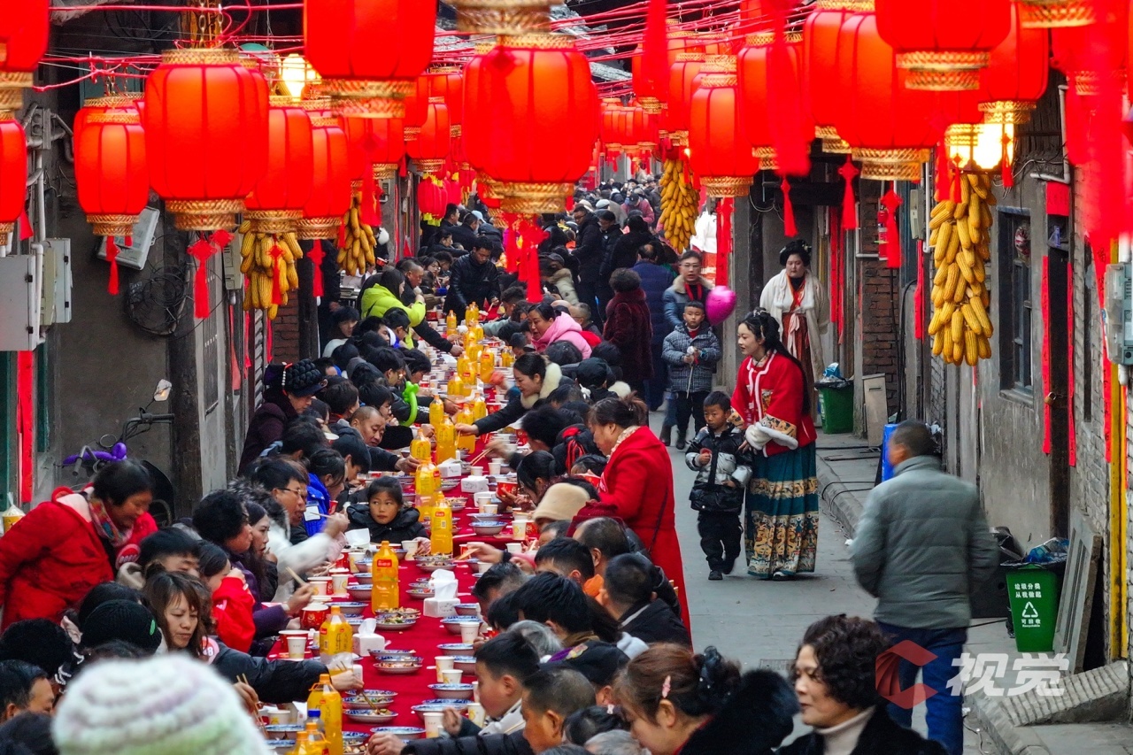 古韵悠长的老街,高挂的红灯笼显得格外喜庆,从街头到巷尾,被串联在一起的不仅是布满美食的长桌,还有地地道道的浓浓年味。