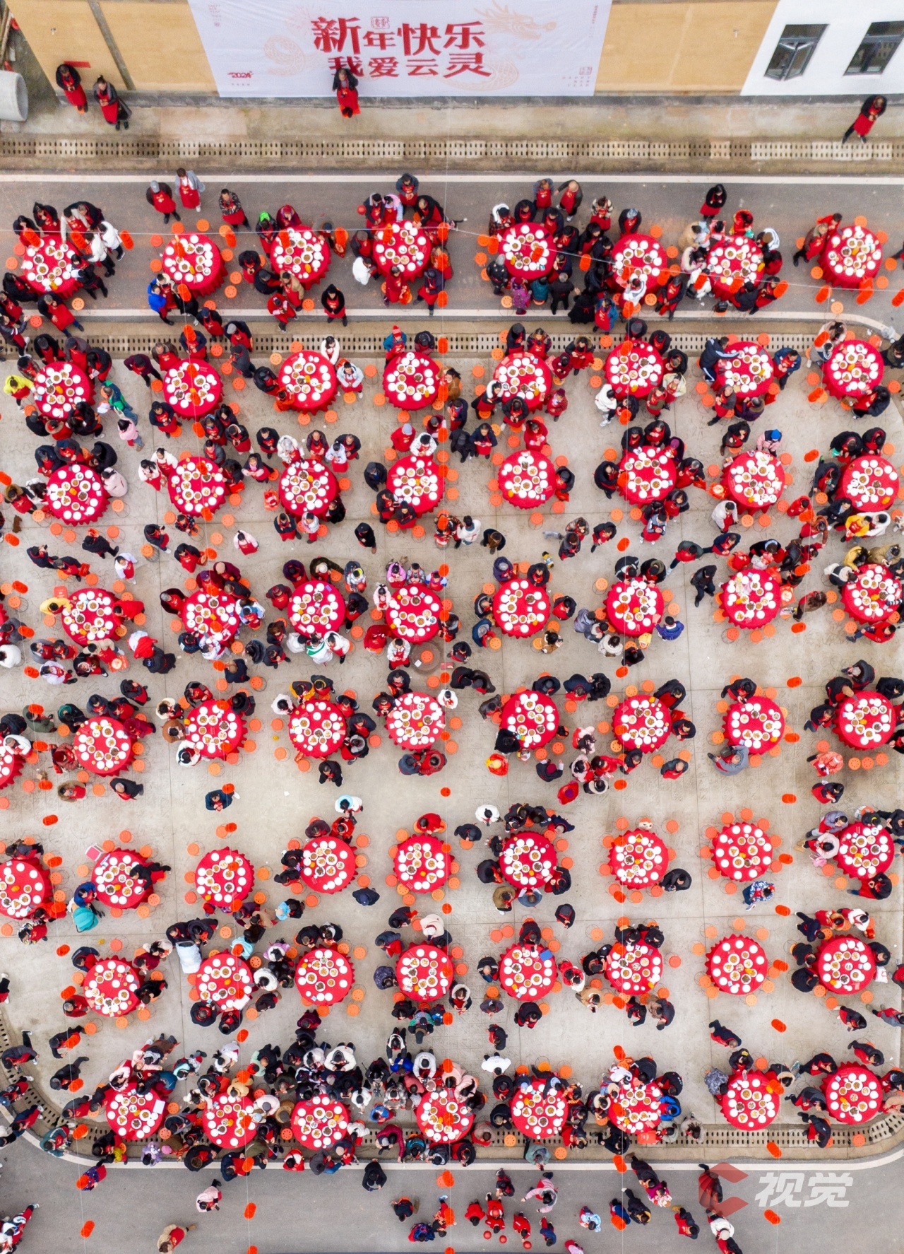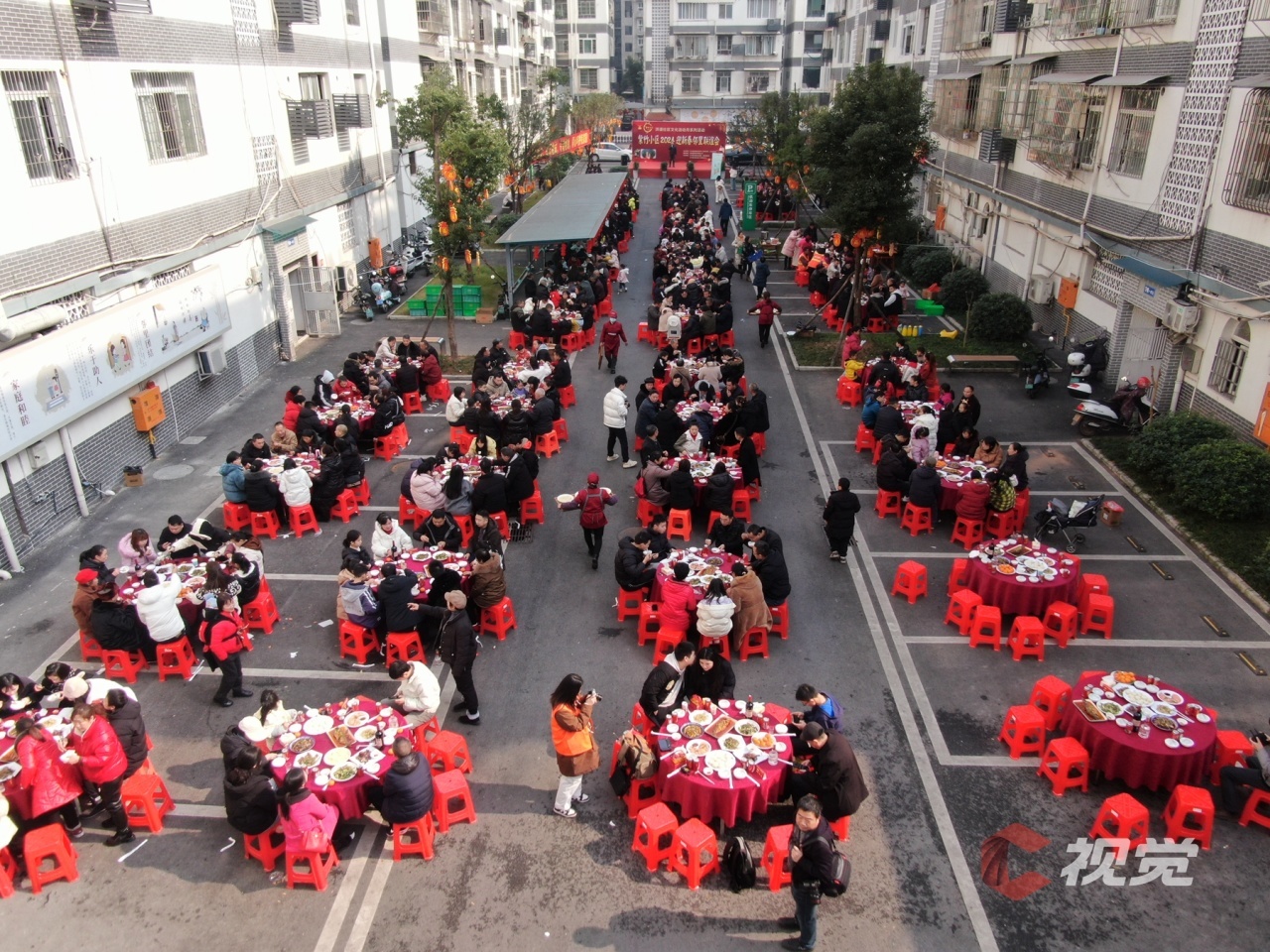 泸州市合江县江北新城学府家园,150桌长街坝坝宴整齐排列,市民团聚在一起观赏歌舞,喝年猪汤,共同讲年俗,一起品年味,感受传统文化魅力,喜迎龙年新春到来。