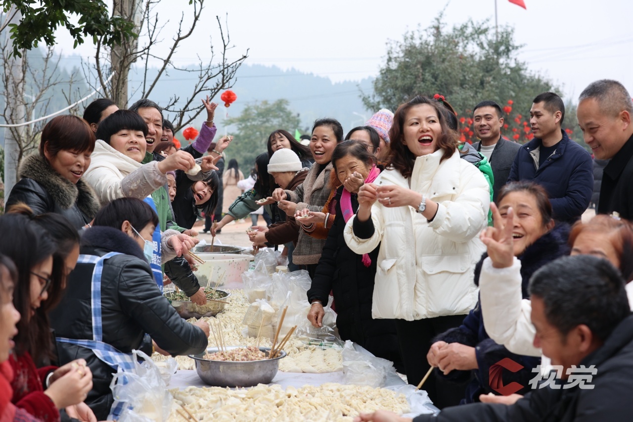 遂宁市安居区凤凰街道岩文社区党群活动中心,社区工作人员邀请居民一起包饺子,400余名居民共享年味时光。