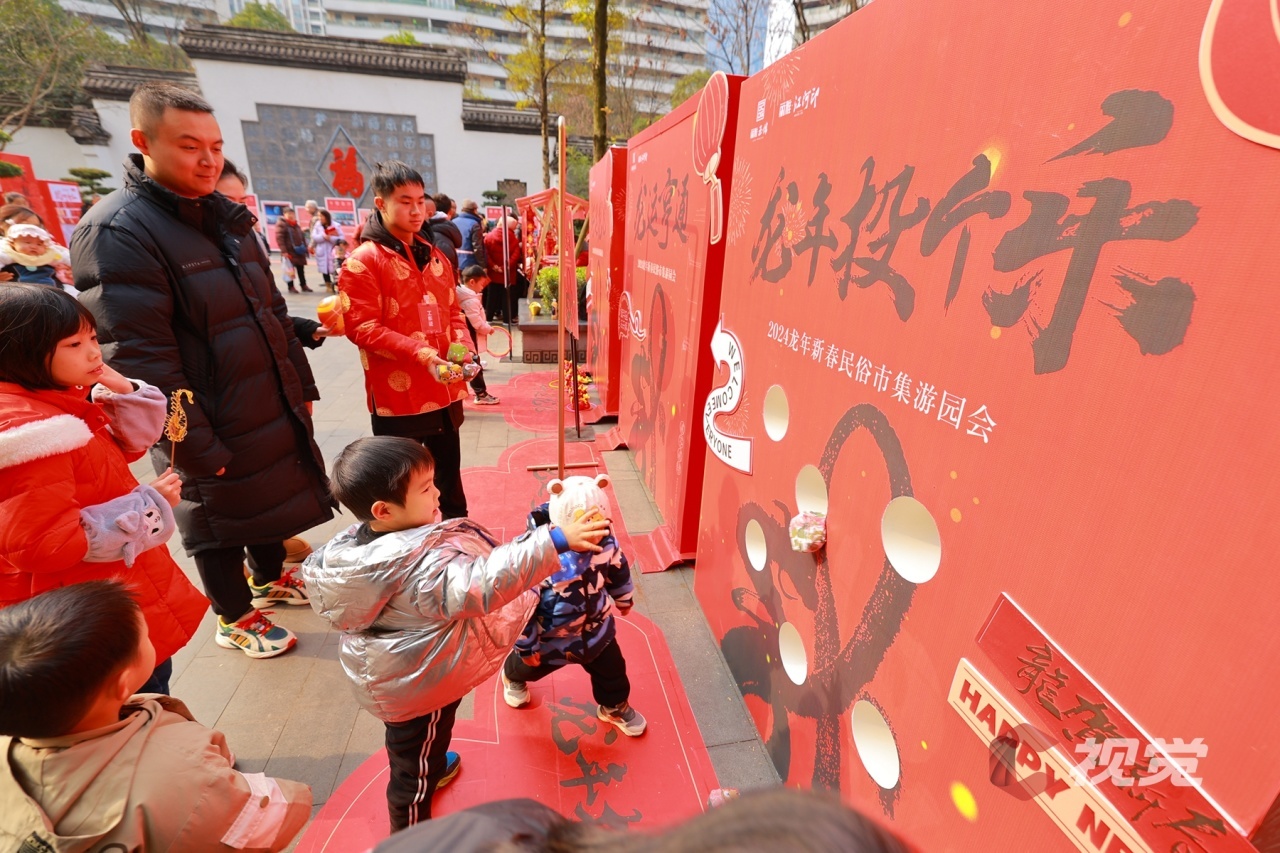 位于宜宾市叙州区的丽雅龙城小区“福”字广场,小朋友参加新春民俗市集游园会。