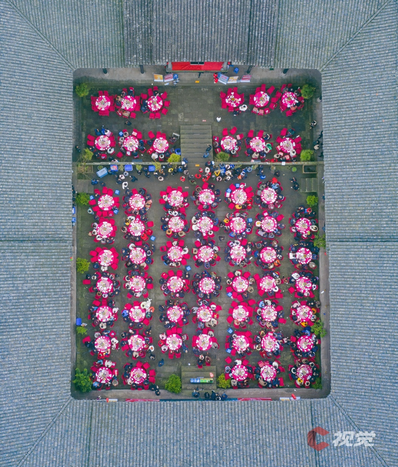 眉山市青龙老街修缮后正式开街,50余张圆桌,500多名社区居民齐欢聚一堂,共品菜肴,共话邻里情,构建起更和睦的邻里关系。