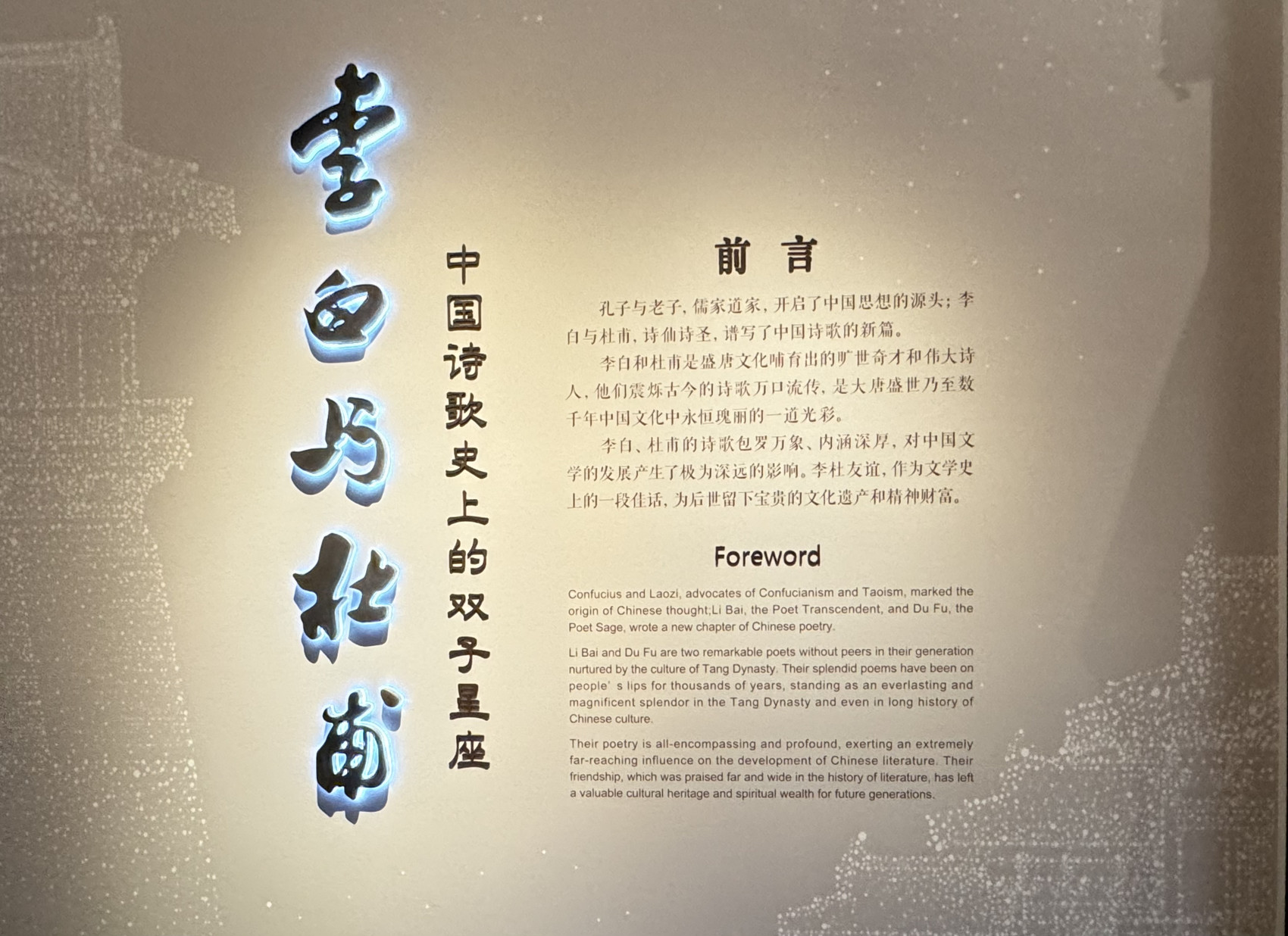 “李白与杜甫——中国诗歌史上的双子星座展”展厅位于杜甫草堂大雅堂后,由原先的古籍修复展示馆改造而来,展厅匾额取自北宋苏轼书法集字,题为“李杜堂”。展厅门口是当代画家袁武的人物线稿《白居易<读李杜诗集>诗意画》,以此烘托李白与杜甫的友谊。展陈分为“盛世华章”“双子星座”“海内知己”“光焰万丈”四个单元,对李白、杜甫所处的盛唐时代,李白与杜甫的相识与友谊,李白与杜甫各自的诗歌成就和后世影响等内容进行了全景式呈现。