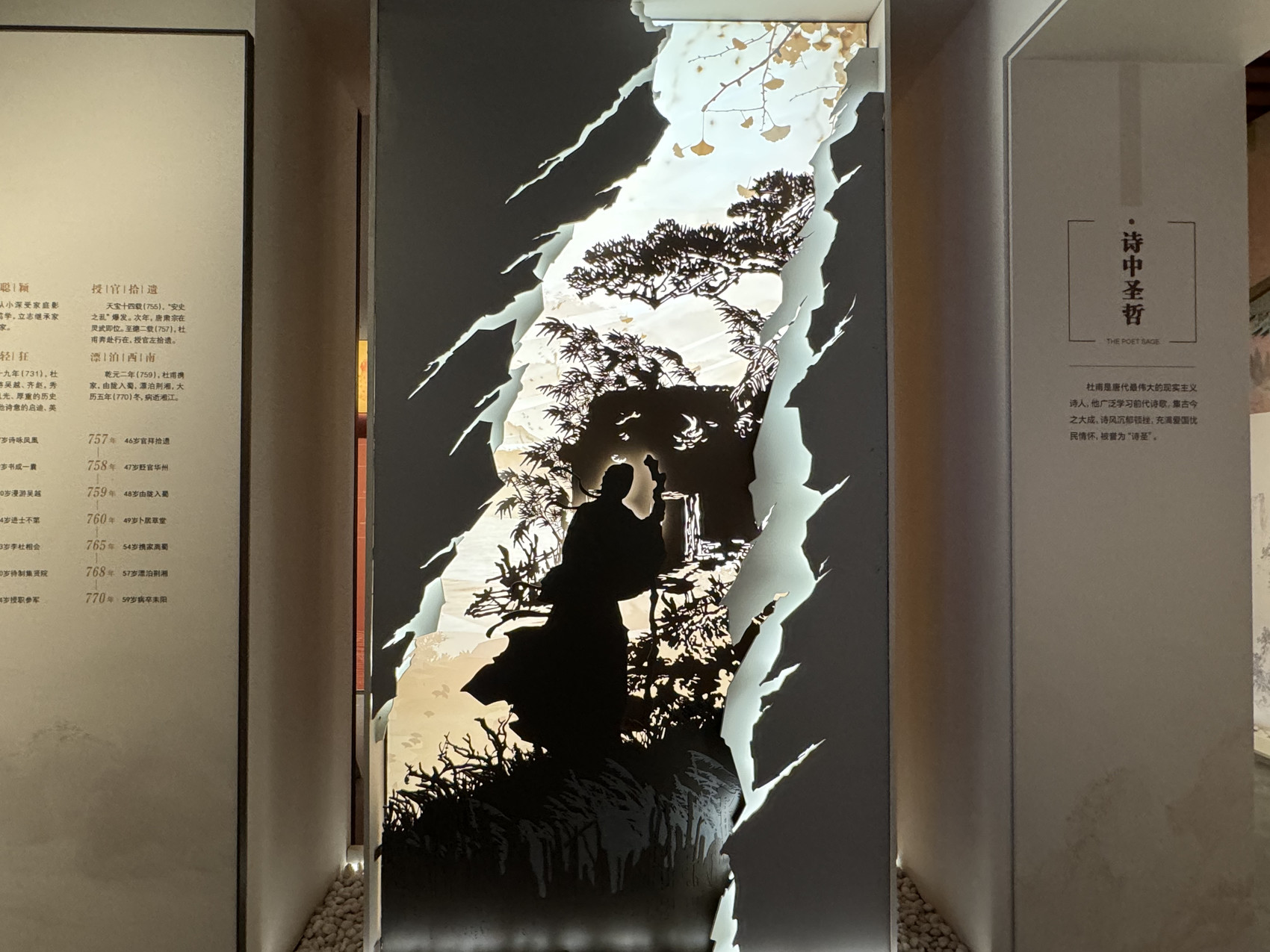 值得一提的是,展厅中通过层景装置的形式对李杜形象进行了剪影式呈现,其中选取的李白形象为“把酒对月”,杜甫的形象为“茅屋为秋风所破歌”。此外,精心设计的沉浸式诗歌体验空间,以李杜二人互赠的诗歌为内容,在墙面投影区域设置几个互动区,当有观众出现在指定位置,感应器识别到观众后会将人体轮廓投影在墙面,让人影轮廓与文字形成互动。