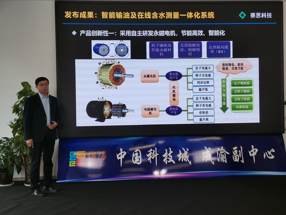 为提升油田智能化水平,一家绵阳科技公司自主研发了“智能输油及在线含水测量一体化系统”。据绵阳赛恩新能源科技有限公司相关负责人介绍,该系统采用高效节能永磁电机替代传统感应异步电机,实现电机节能 8%;采用新型转子容积泵替代齿轮泵,提高泵效率和输送压力。此外,该系统还配备了井口在线含水测量功能,可实时监测每口井出油量、含水量,为数字化油田建设提供关键数据。