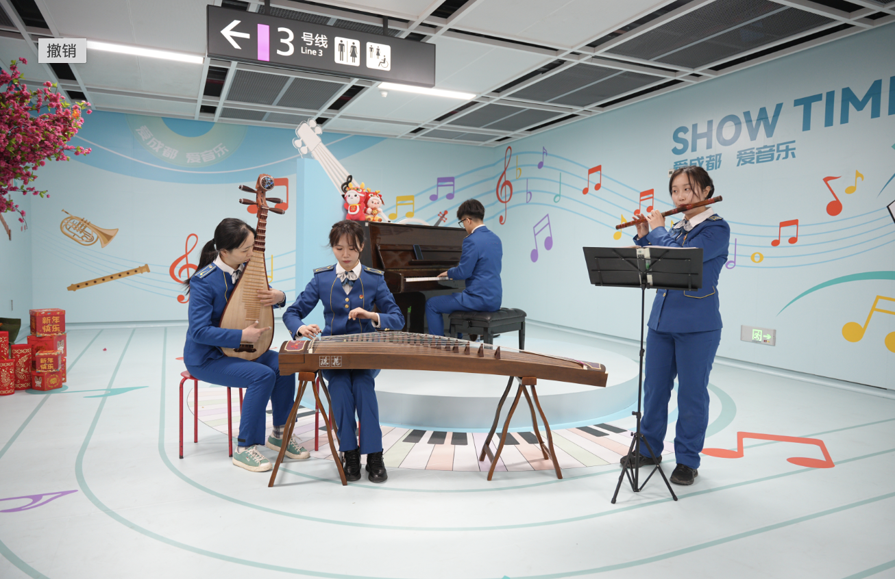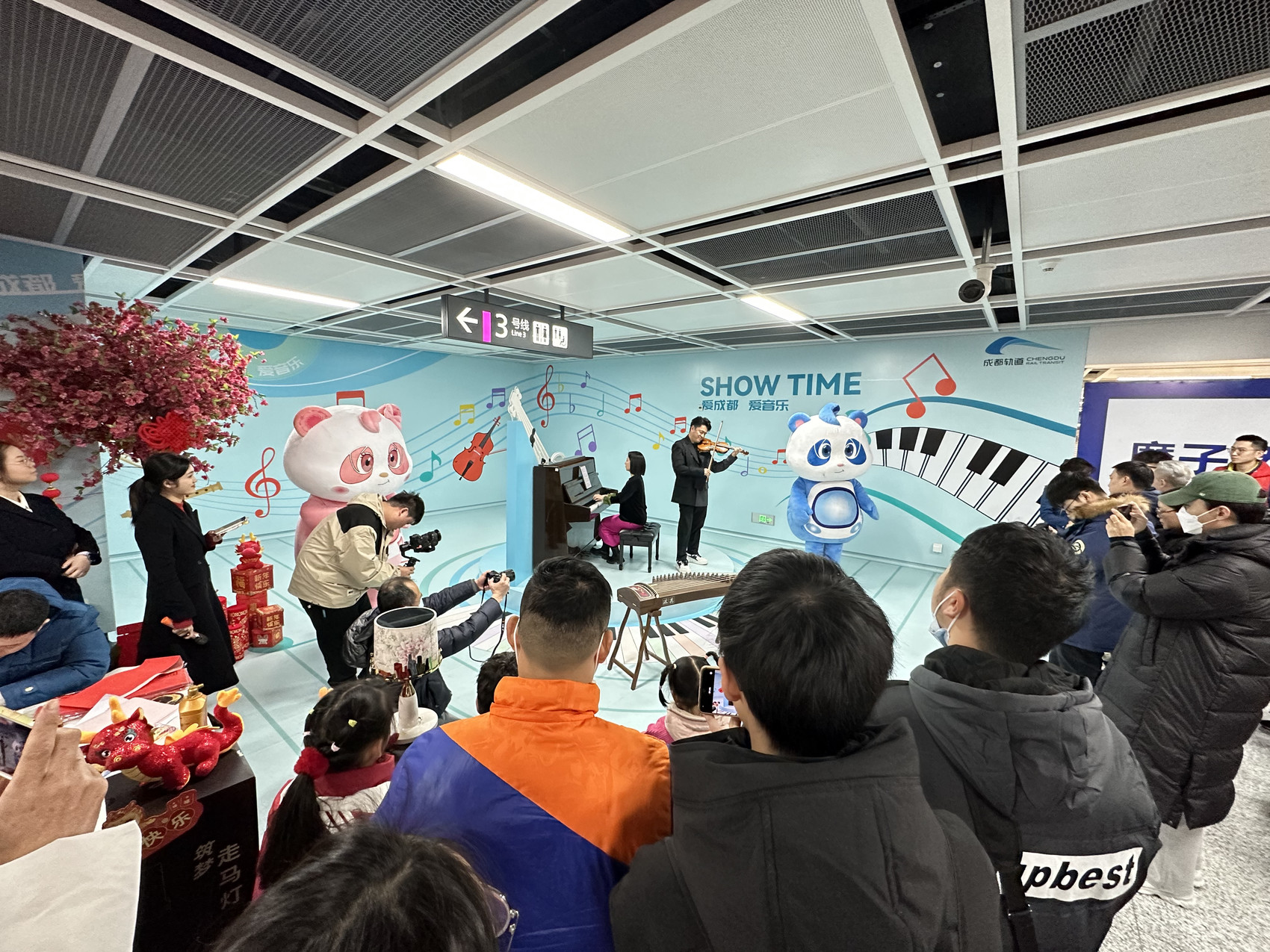 春节将至,悠扬琴音在成都地铁3号线磨子桥站空间奏响,吸引南来北往的到站乘客汇集,感受地道的成都“年味”!