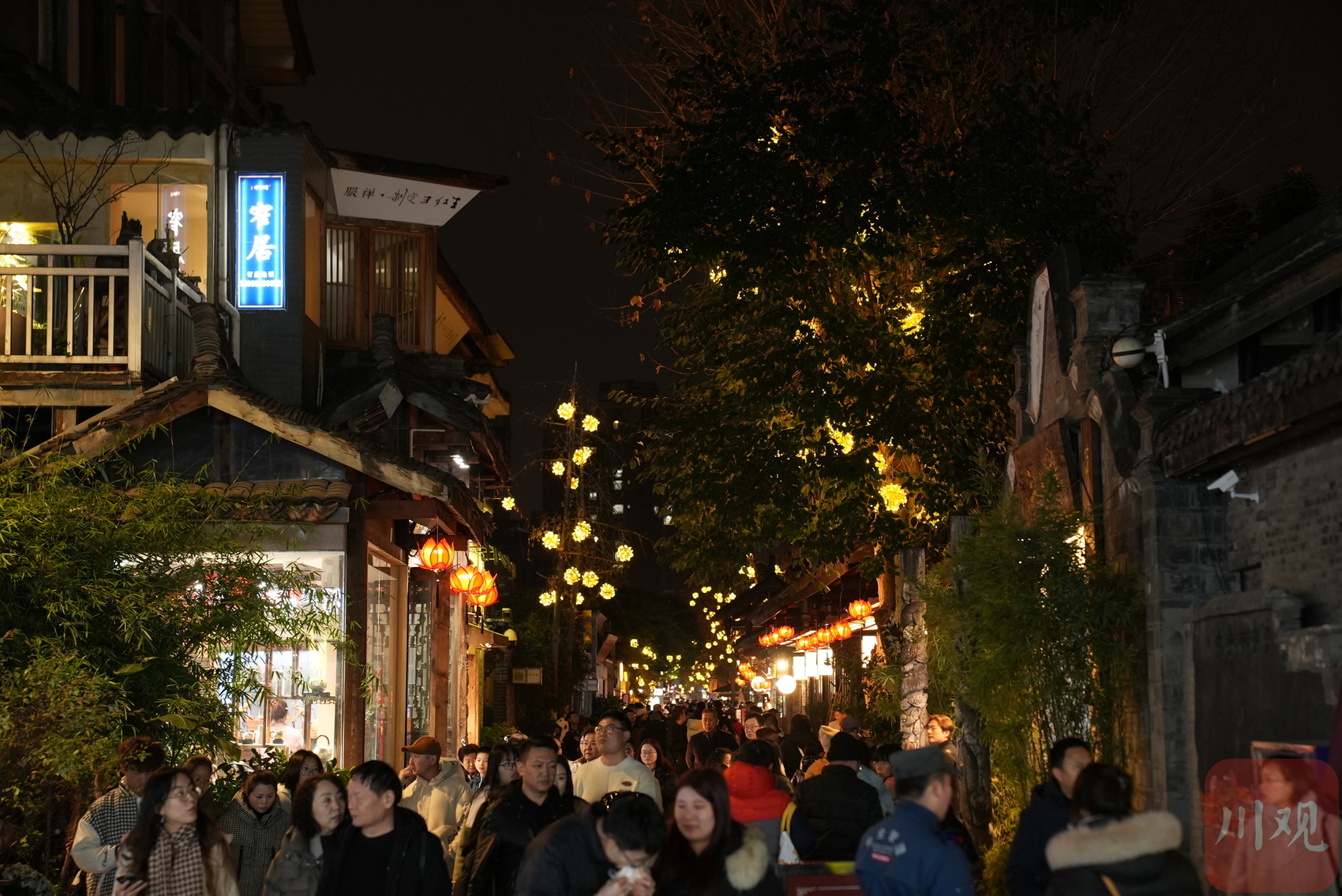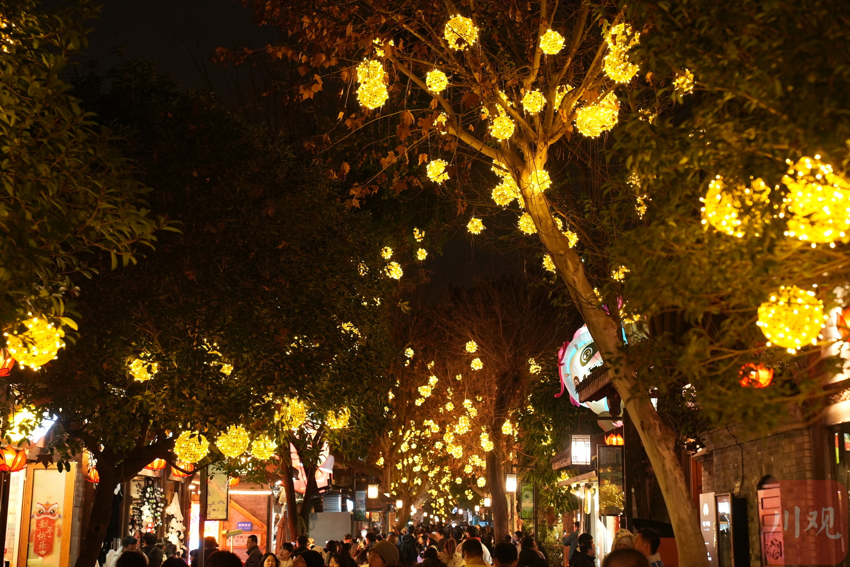 街巷两旁的树梢上挂满了灯串