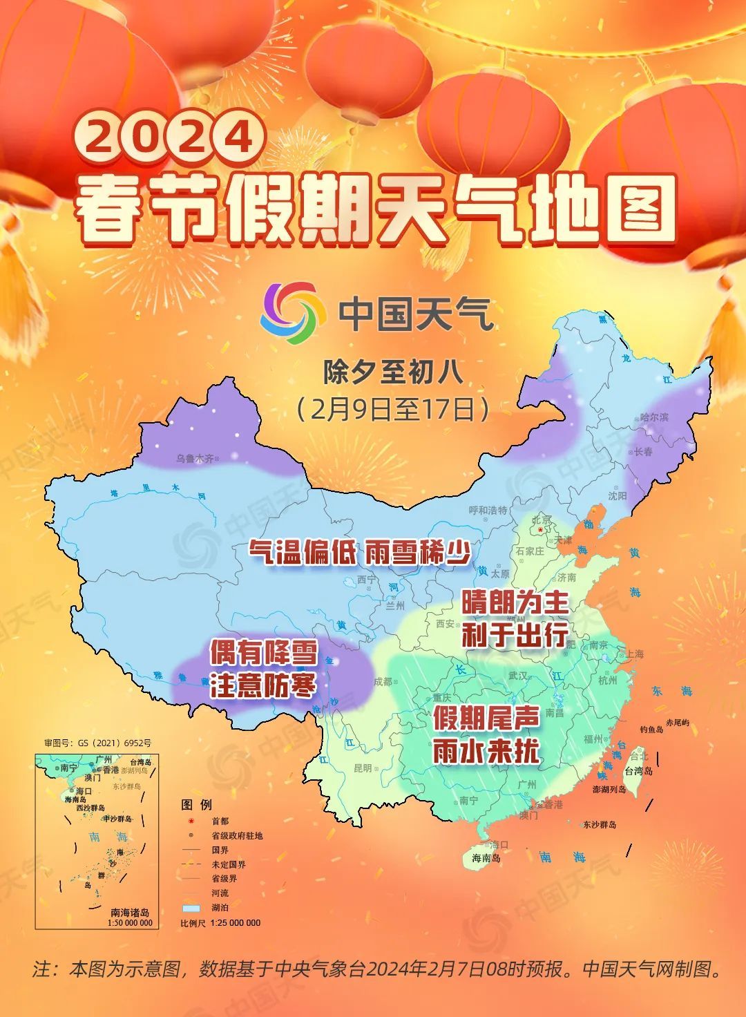 今天(2月7日),中央气象台正式发布春节假期天气预报,预计2024年春节假期(除夕至初八),我国无大范围雨雪冰冻及持续雾、霾等灾害性天气,假日前期大部天气晴好,气温回升,后期受冷空气影响,我国将出现一次降温和雨雪天气过程,返程需注意防寒保暖。中国天气网推出2024春节假期天气地图,快来看看你家的天气如何。