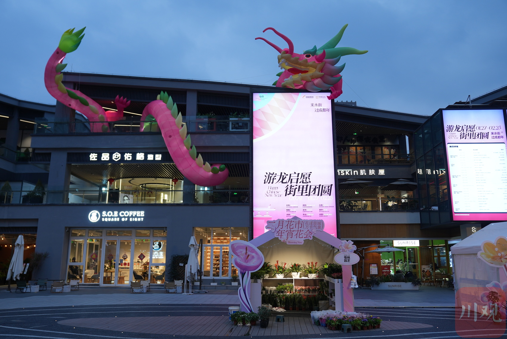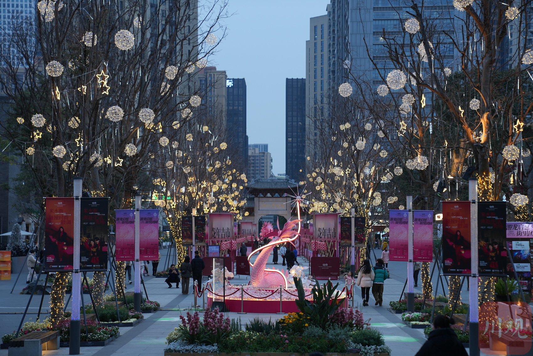 除了龙形主题装置,成都铁像寺水街已开启“游龙启愿 街里团圆”春节系列活动:《玄龙》环境戏剧巡游、新春游园会、年宵花会……多重活动再现诗词里的节日氛围。