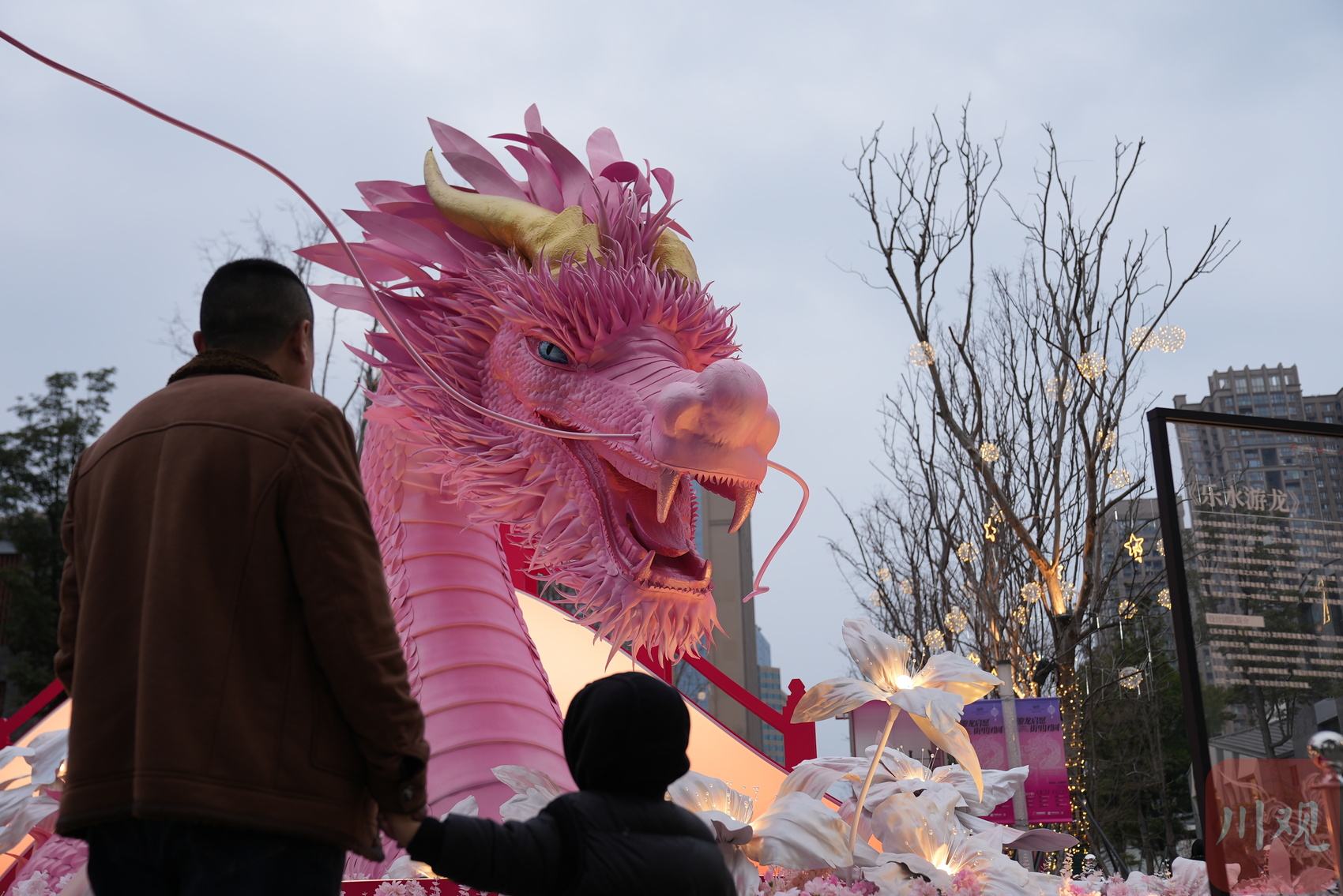 一位父亲带着孩子来到铁像寺水街看粉色巨龙