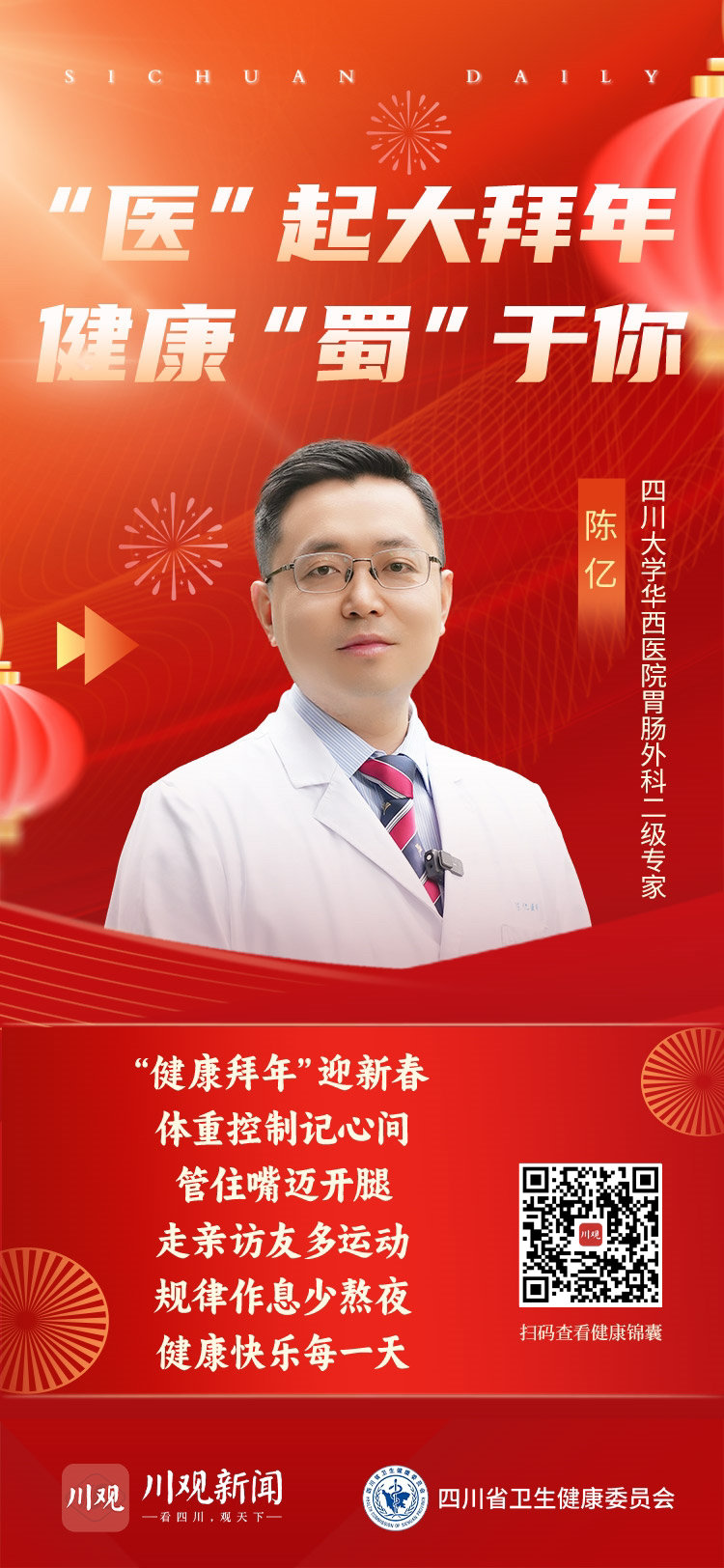 每到新春佳节 ,少不了大鱼大肉的聚餐,跟亲朋好友一起吃吃喝喝,但很多人因此管不住体重,血糖、血压、血脂相关指标也可能会出现异常。本期邀请四川大学华西医院胃肠外科二级专家陈亿为您健康支招。