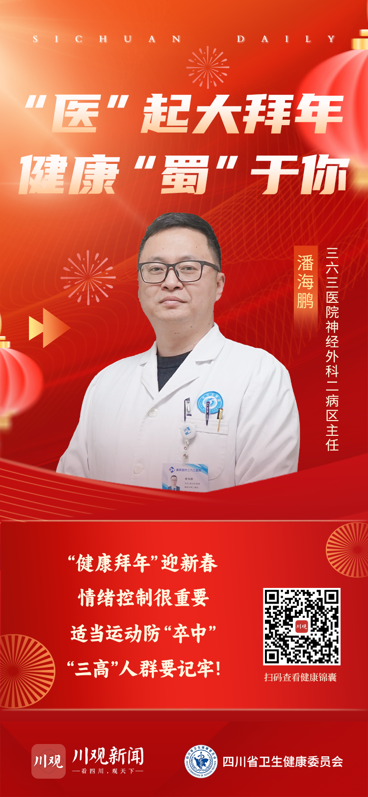 2月10日至2月17日,龙年春节假期,川观新闻联合四川省卫生健康委员会推出《医本正经》健康科普专栏春节特别策划——“健康拜年”迎新春,邀请四川“网红”医生为大家送上新春祝福和健康提醒。