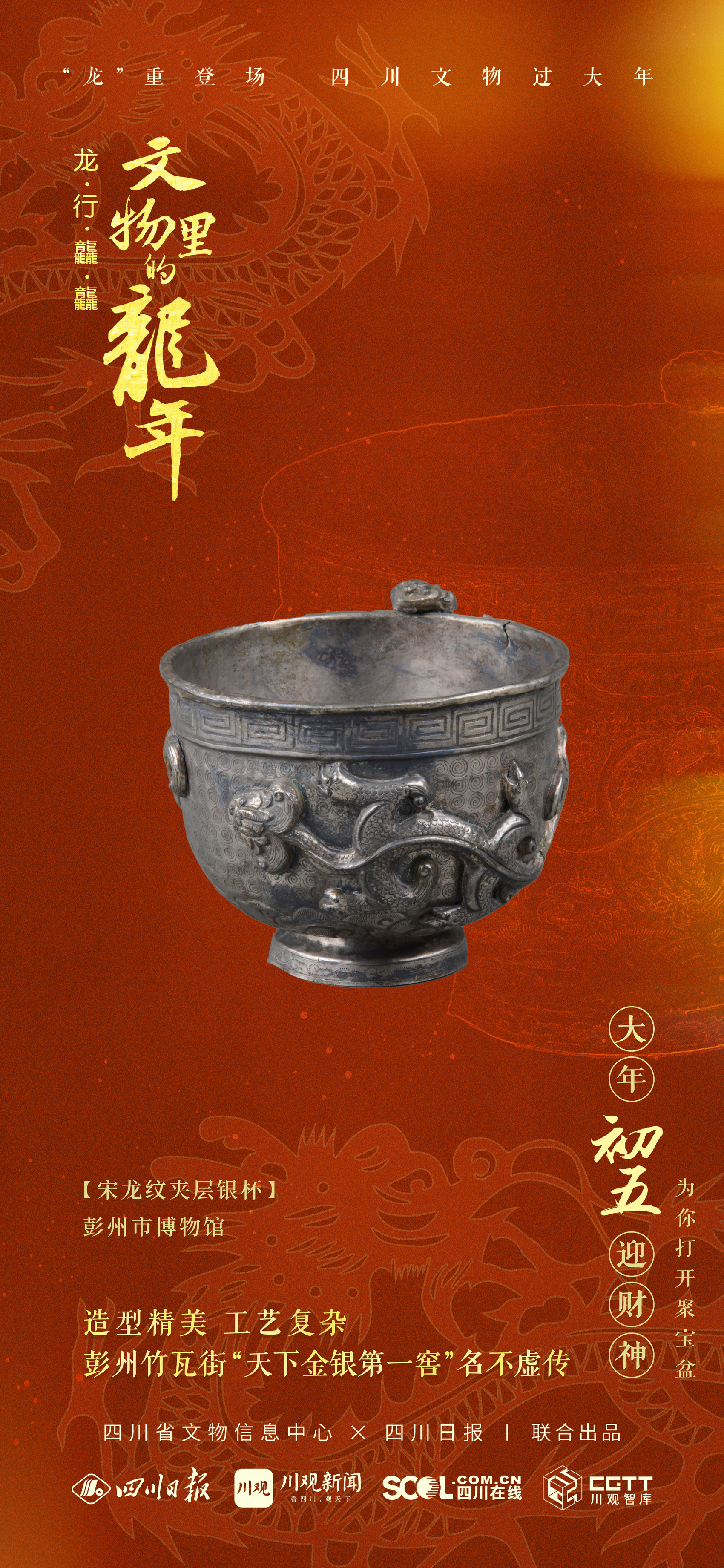 这件南宋时的文物1993年出土于彭州市西大街金银器窖藏中,是主人审美和财富的象征。它不仅造型精美、纹饰生动,更关键夹层技法是宋代金银器制作的新工艺,以此技法制成的器物不仅具隔热的功用,还使器物显得更加厚重。装饰龙纹的夹层银杯则尚属首次发现。