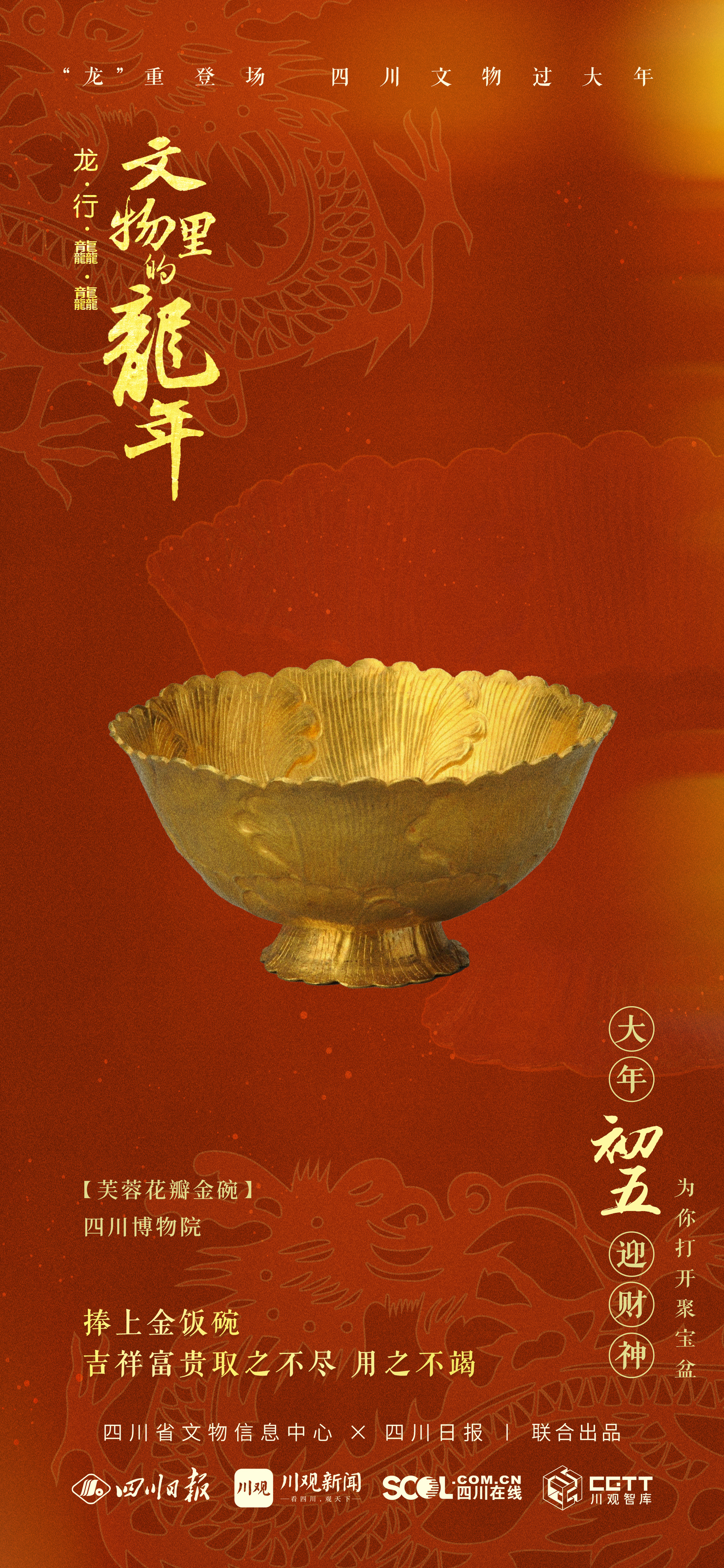 四川博物院的这件芙蓉花瓣金碗,制作精细、纹饰精美,似一朵盛开的芙蓉花。其朴质无华、典雅自然的器型特点与宋人追求简约,崇尚淡雅的审美情趣相契合。但是,它又是主人财富的象征,堪称优雅地满足了古人对物质和精神的双重需求。