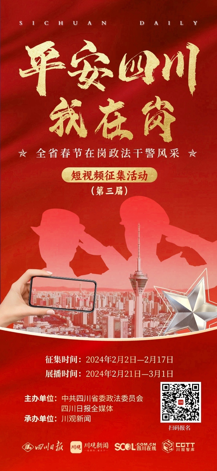 由省委政法委和四川日报全媒体联合发起的“平安四川我在岗”短视频征集活动(第三届)正在火热进行中。即日起至2月17日,活动邀请全省政法干警和广大网友,一起拿起手机,记录全省政法干警在节日期间坚守岗位、服务群众的暖心视频。