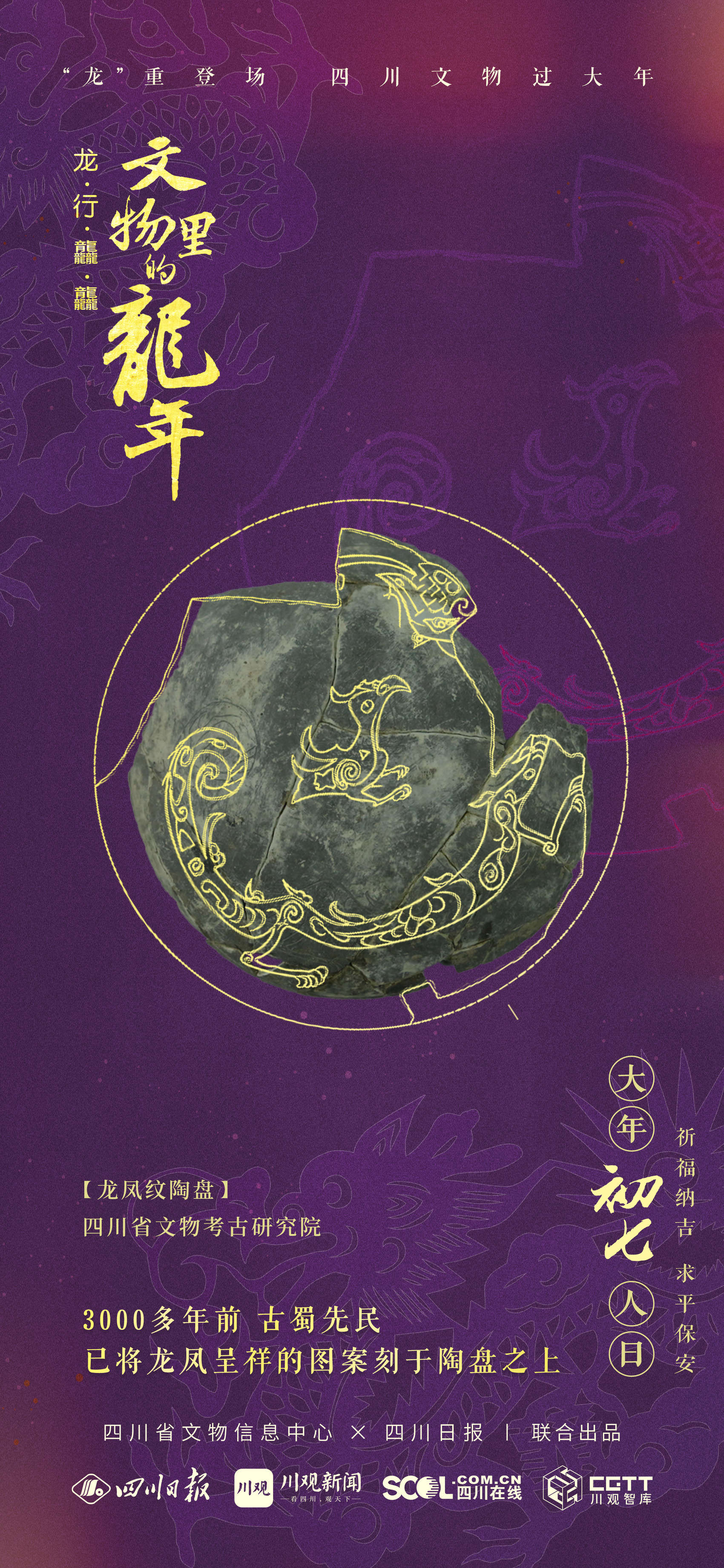 龙年,今天继续给大家推荐一件和龙有关的文物——龙凤纹陶盘,它出土于天府大道北延线广汉联合遗址,是较早出现“龙凤配”图案的文物。这件文物距今约3200年左右,陶盖顶部中央,一只有羽冠的鸟昂首而立;盖顶的边缘,清晰可见一条游龙盘旋在鸟的周围,嘴里似乎喷出一道火焰,整体造型动感十足。这是目前国内出现龙凤组合的最早文物之一,清晰诠释了中华文明中“龙凤呈祥”的寓意及源远流长的历史。