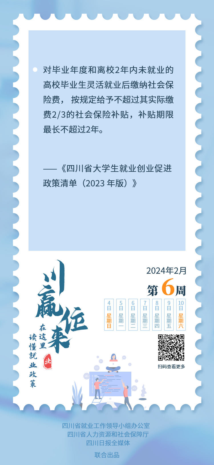 为认真落实党中央、国务院和省委、省政府关于促进高校毕业生就业创业决策部署,近日,省就业工作领导小组办公室会同省级相关部门,汇总编辑了《四川省大学生就业创业促进政策清单(2023年版)》,作为学习宣传和执行政策的参考资料。在该清单的“大学生毕业后”章节,详细列举了高校毕业生毕业后就业创业相关优惠政策,本期“川赢位来·就业政策周历”一起来了解一下其中的“社保补贴和岗位补贴”。