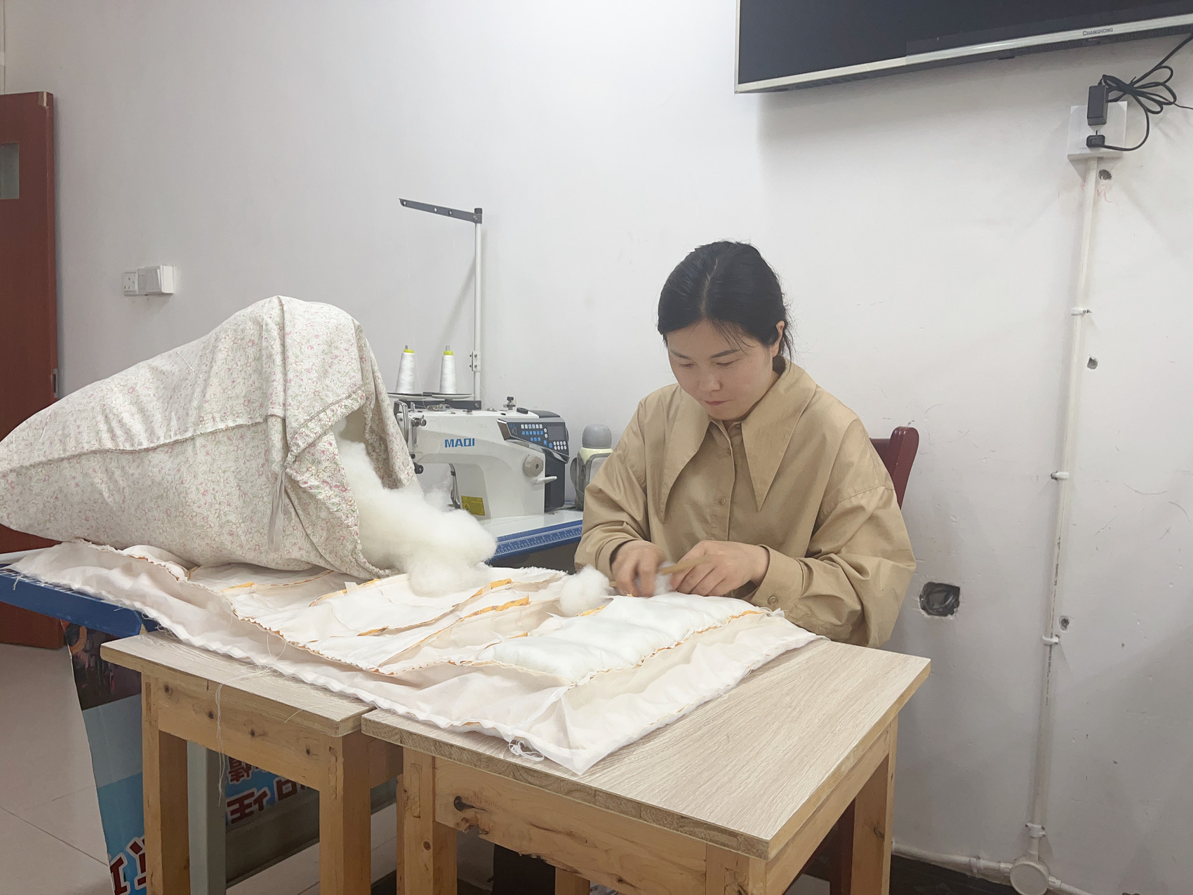 缝纫、拼接、上花边、上底布……2月4日,临近春节,车间里依然忙碌,工人们正在赶制一批浙江急需的坐垫。