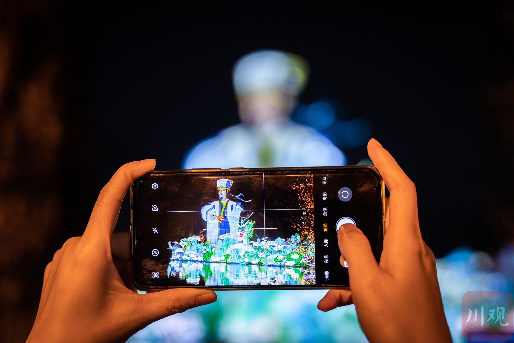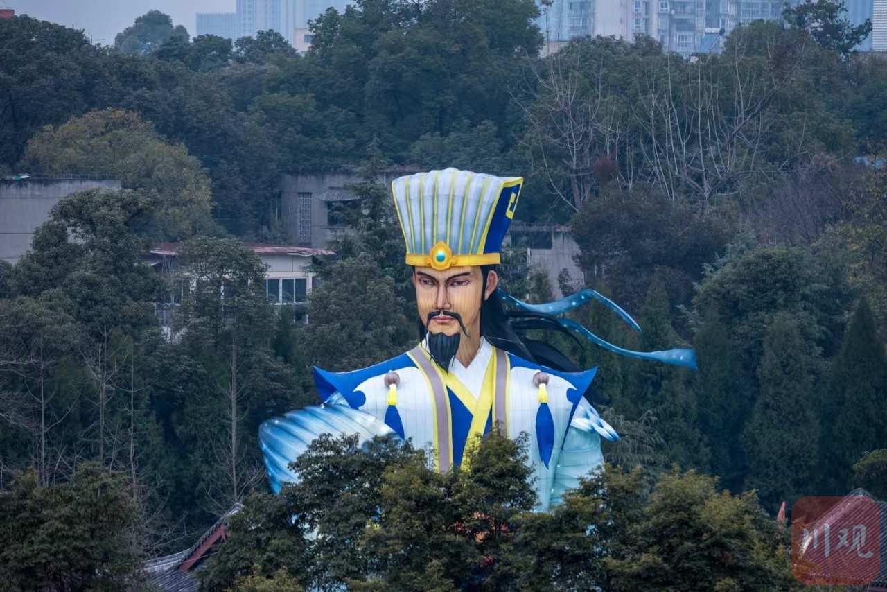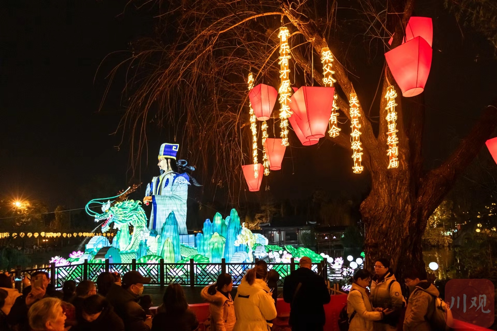 首先映入眼帘的便是梦幻神秘的“空城计”灯组。身披鹤氅的卧龙先生,端坐于高台之上,淡定抚琴,羽扇在他身后化作翅膀,青龙环绕,烈焰升腾,若雷霆万钧之势。造型炫酷的灯组吸引了市民们热情打卡。中轴线上,长达130米的“蜀汉盛景”灯组,以彩灯形式展示出三国文化遗存遗迹,可谓别具匠心。该灯组中,成都武侯祠博物馆选取了武担山、明月峡、剑门关等四川省9处三国文化遗存,蜀道雄关,青山飞瀑,仙鹤花草,挑浮在半空,让中轴线宛如仙境隧道,古迹在光影中再焕光彩。