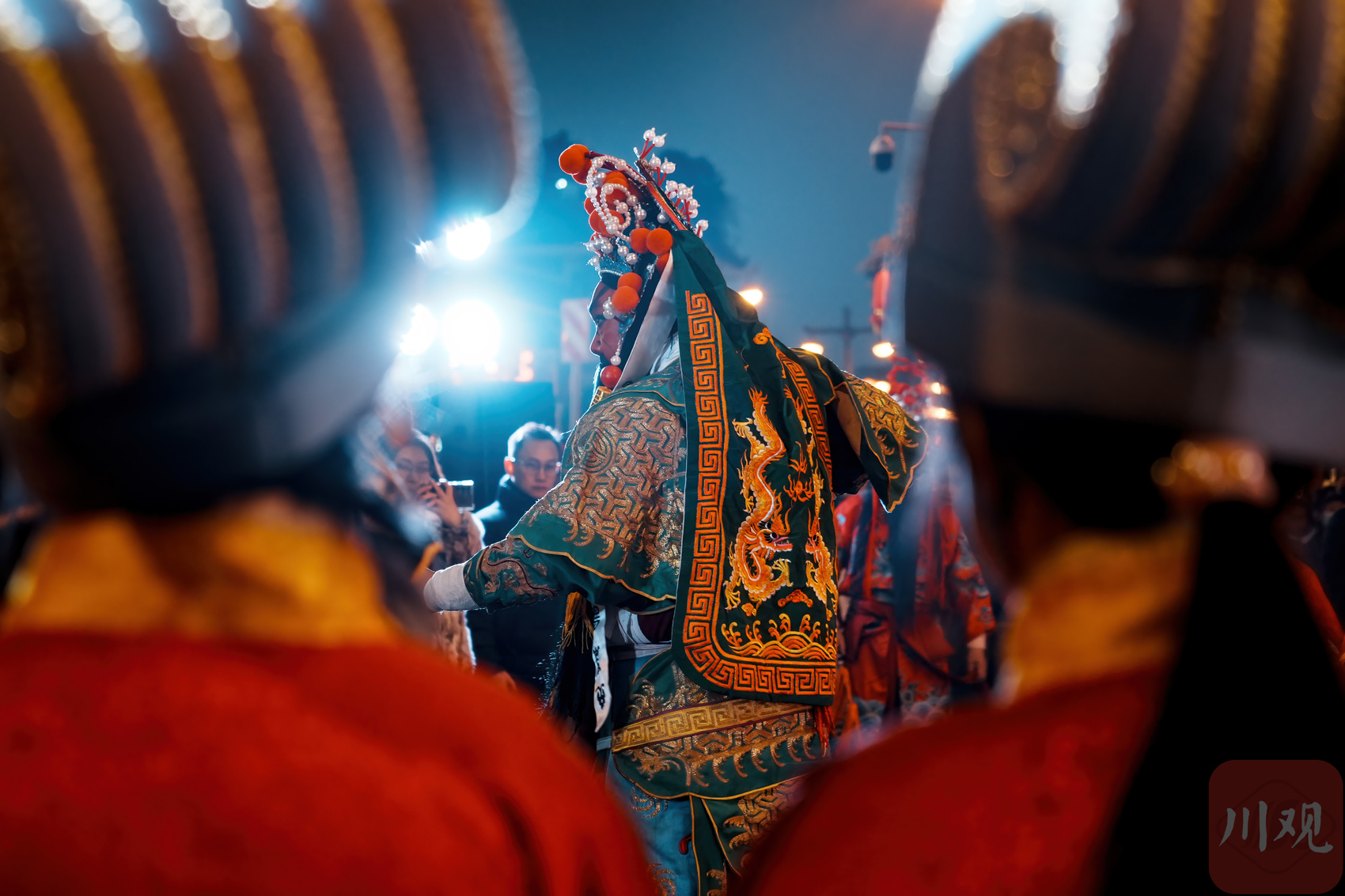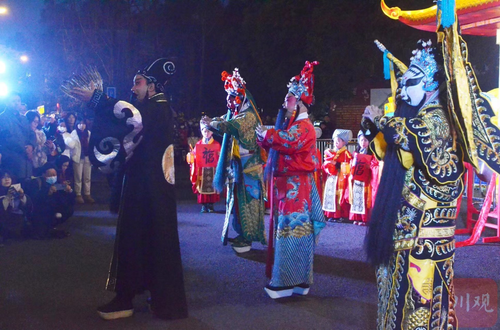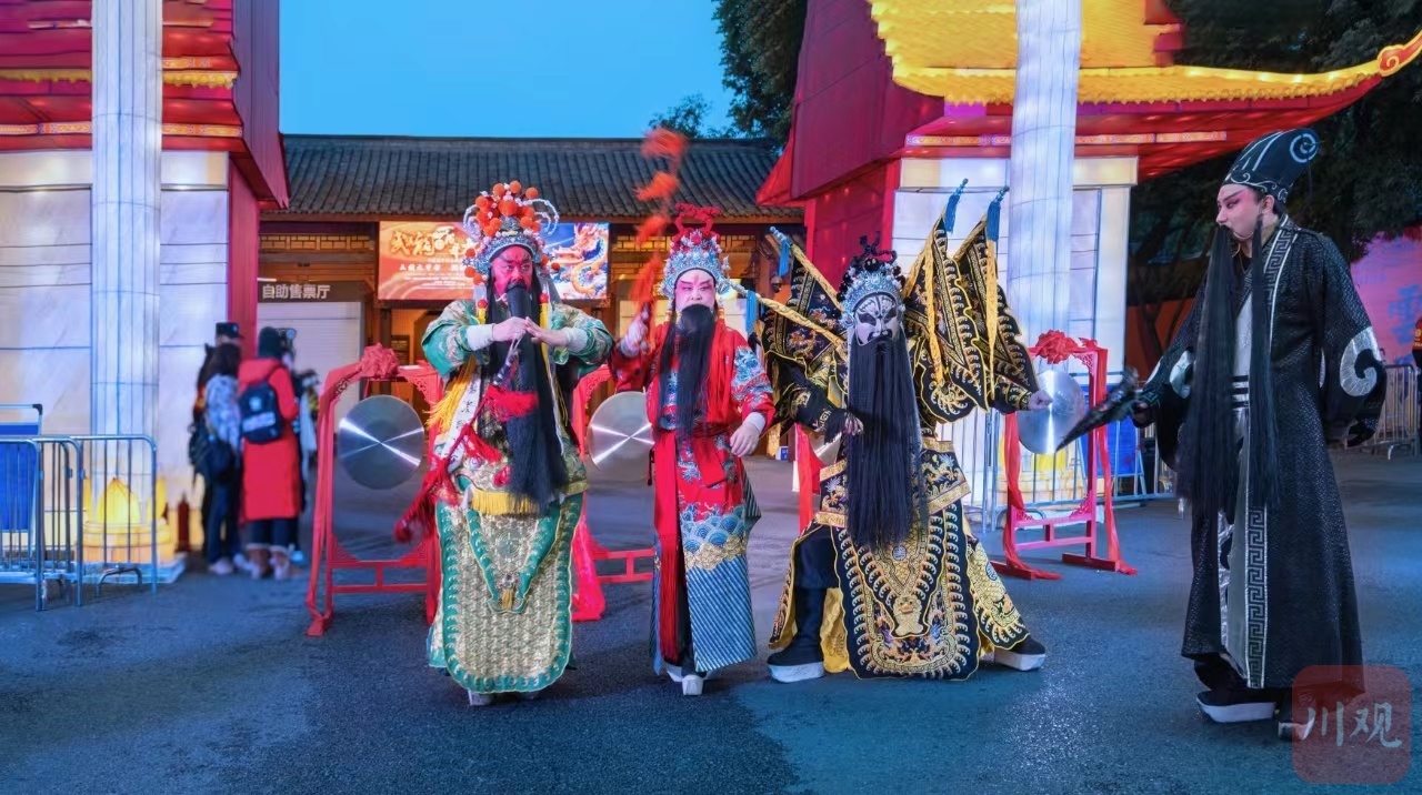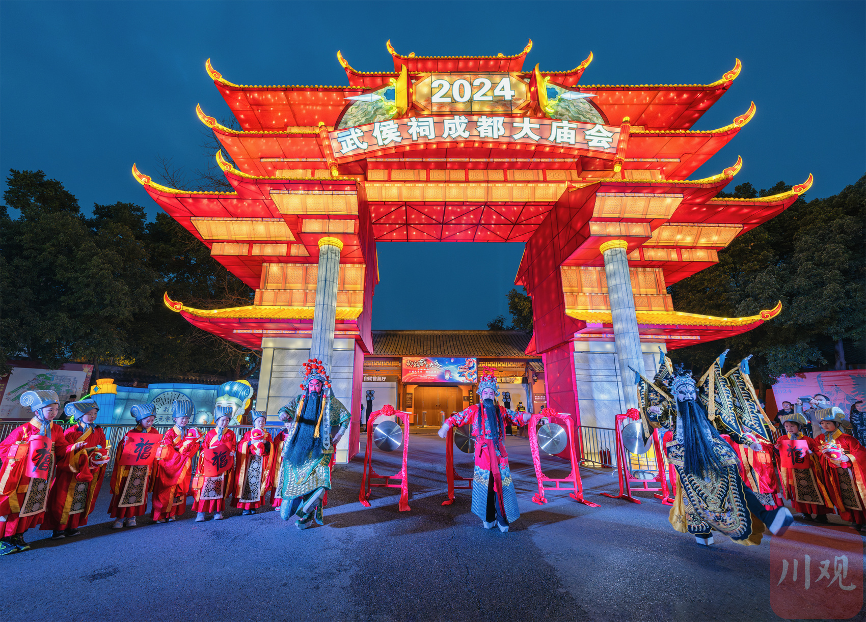 傍晚6点左右,华灯初上,成都武侯祠博物馆西区门外早已围满热情的市民观众,大家翘首盼望着开庙仪式的举行。门口长22米、高15米的汉宫门阙,明黄瓦面,重檐高耸,饰以祥云凤鸟,如同一位峨冠博带的君子,引领大家一起进入千年画卷。晚上7点,由川剧演员扮演的刘备、关羽、张飞身着华丽的戏服依次登场,手持羽扇的诸葛亮面带微笑送上新春祝福。