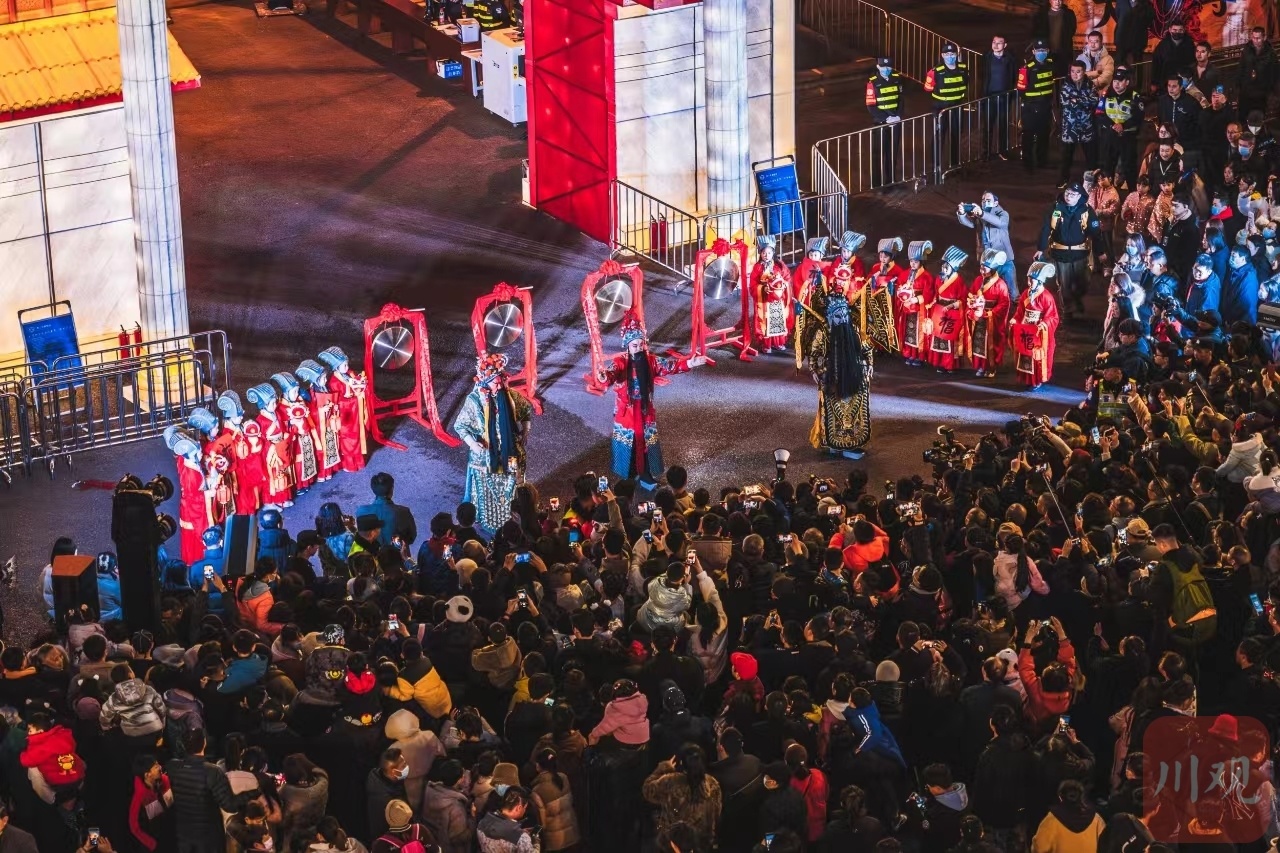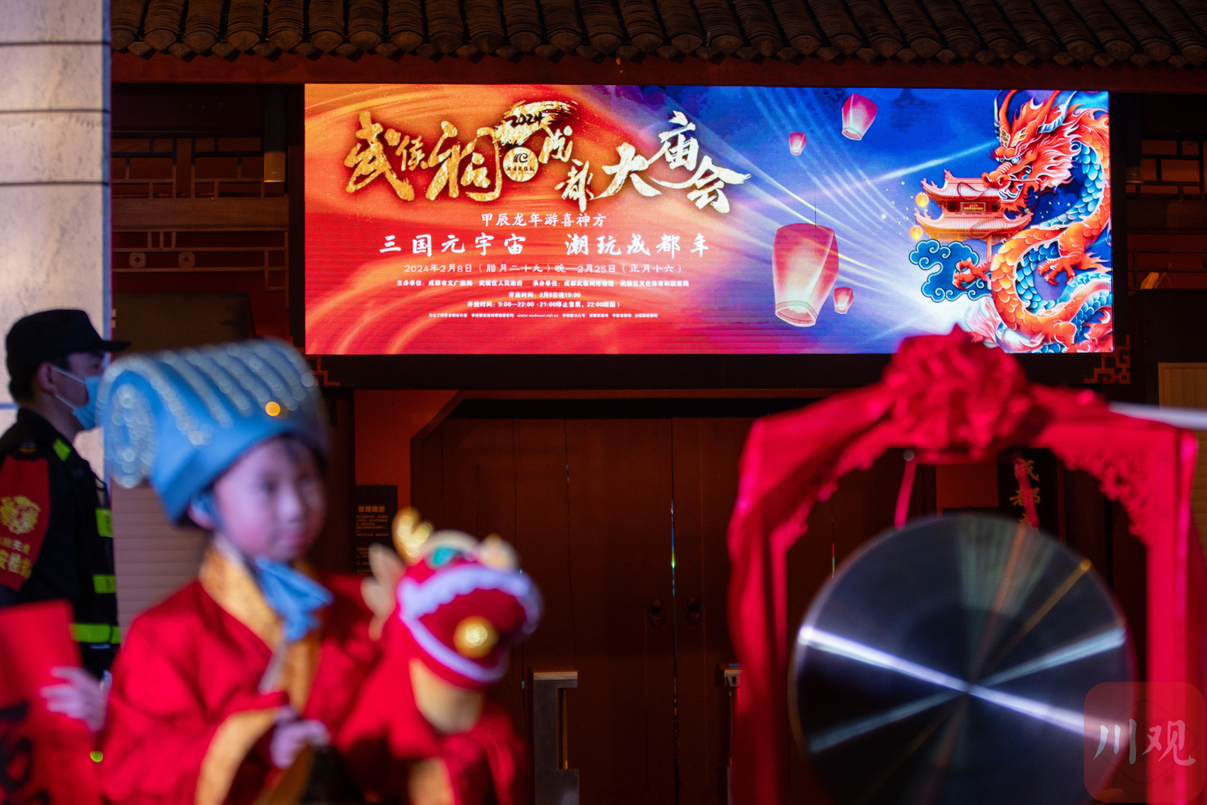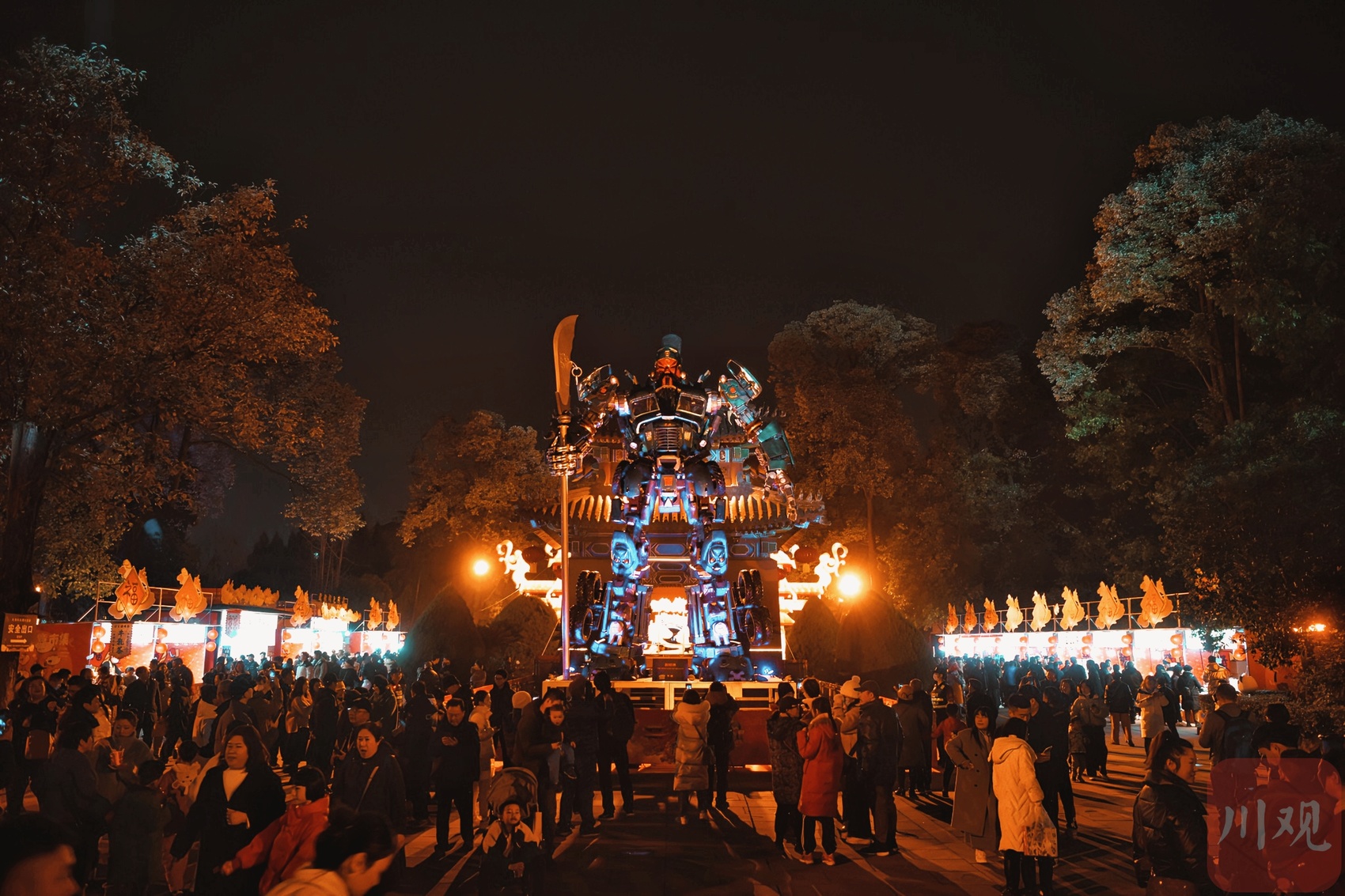 随着浑厚而庄重的锣声响起,武侯祠成都大庙会的庙门徐徐打开。只见高约2米的关羽、赵云机械战甲缓缓走来。身着绿袍金铠的关羽手握青龙偃月刀,威风凛凛,身穿白袍的赵云手拿龙胆亮银枪,现场气氛达到高潮。随后,市民们跟随着关羽、赵云机甲人走入了大庙会。