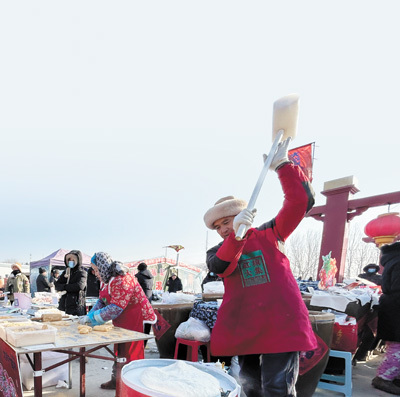 黏豆包、驴打滚、炖酸菜……红旗大集是当地特色美食的聚集地。鏊子里磕一枚鸡蛋,放一勺肉馅,两面煎至金黄后再摊上一层面糊,没几分钟,一锅香喷喷、热腾腾的肉蛋堡便出炉了。摊主陈吉祥是一名00后,他告诉记者:“高中毕业后我到外地工作,总会回忆起小时候跟爷爷奶奶赶大集的场景,集上各种好吃的、好玩的,来赶集的都是十里八乡的人,别提多亲切了。”