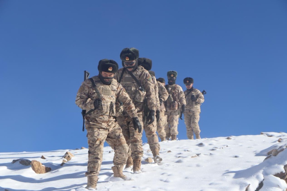 遇到结冰的上坡路,还需凿冰开路。战士们拿出十字镐将冰面砸得坑坑洼洼,然后用铁锹铲些砂石铺上厚实一层,再给车辆加装防滑链,车辆才能安全通过。42公里的砂石路,行驶了2个多小时,终于抵达海拔5410米的某山口,按计划,官兵们还需从山口徒步3公里下到谷底。此处本没有路,这条巡逻路是官兵们一步一个脚印踩出来的。