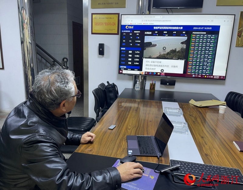 石福明展示“智能声波无网海洋牧场数据大屏”后台。人民网记者 王丽玮摄