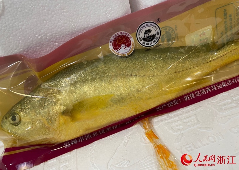 大黄鱼产品上的“温州大黄鱼”地理标志证明商标。人民网记者 王丽玮摄