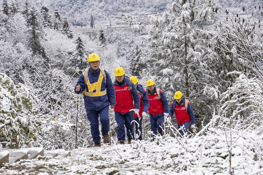 2月9日,在彭水县中岭山,国网重庆电力员工对电力线路开展冰雪特巡。牟伟摄