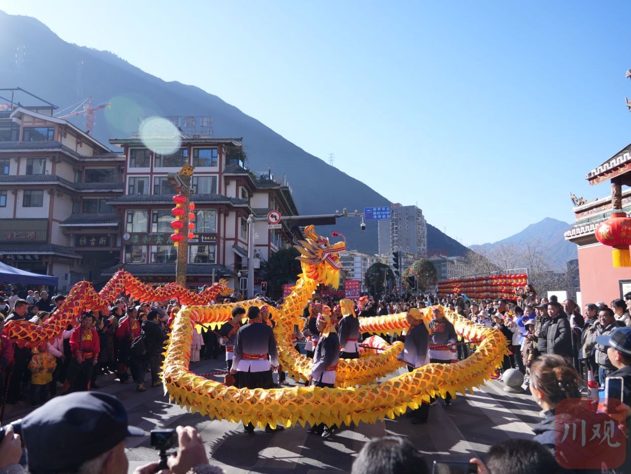 锣鼓、旱船、大头娃娃和神话传说人物纷纷上场亮相,弦子、锅庄、长水袖,整齐划一翩翩起舞;扮演“背二哥”的队伍让人们重温茶马古道的记忆...…在一声声“扎西德勒”的问候中,表演者们纷纷用自己的方式,向围观群众、游客表达着节日的祝福,现场掌声、喝彩声此起彼伏,人们纷纷举起手机拍照,留下这些精彩的瞬间。大家在浓浓年味中,感受“最炫民俗风”,欢度龙年新春。
