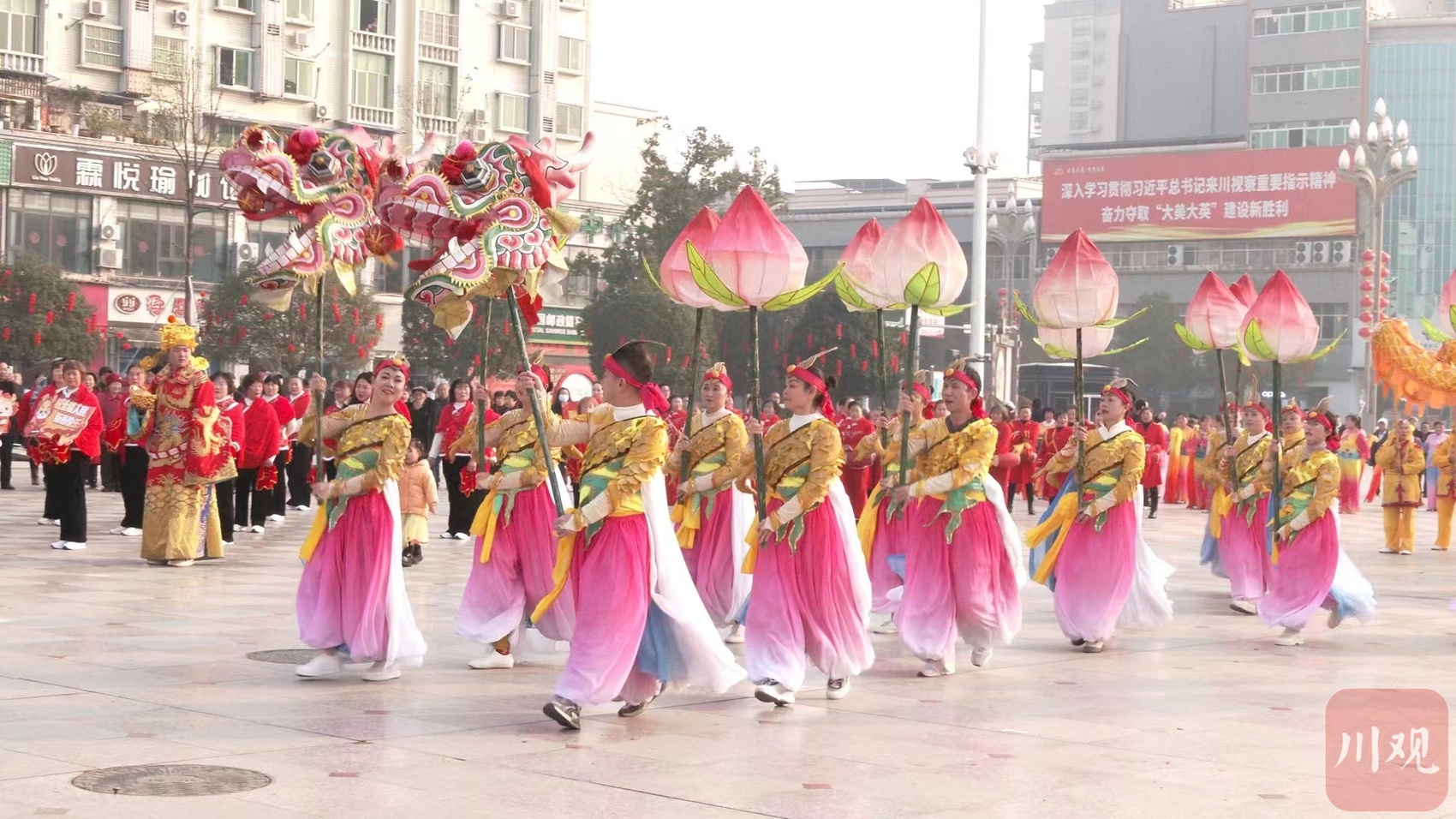 表演团队从大英县政府广场出发,沿着街道巡游表演,道路两旁人头攒动,热闹非凡。