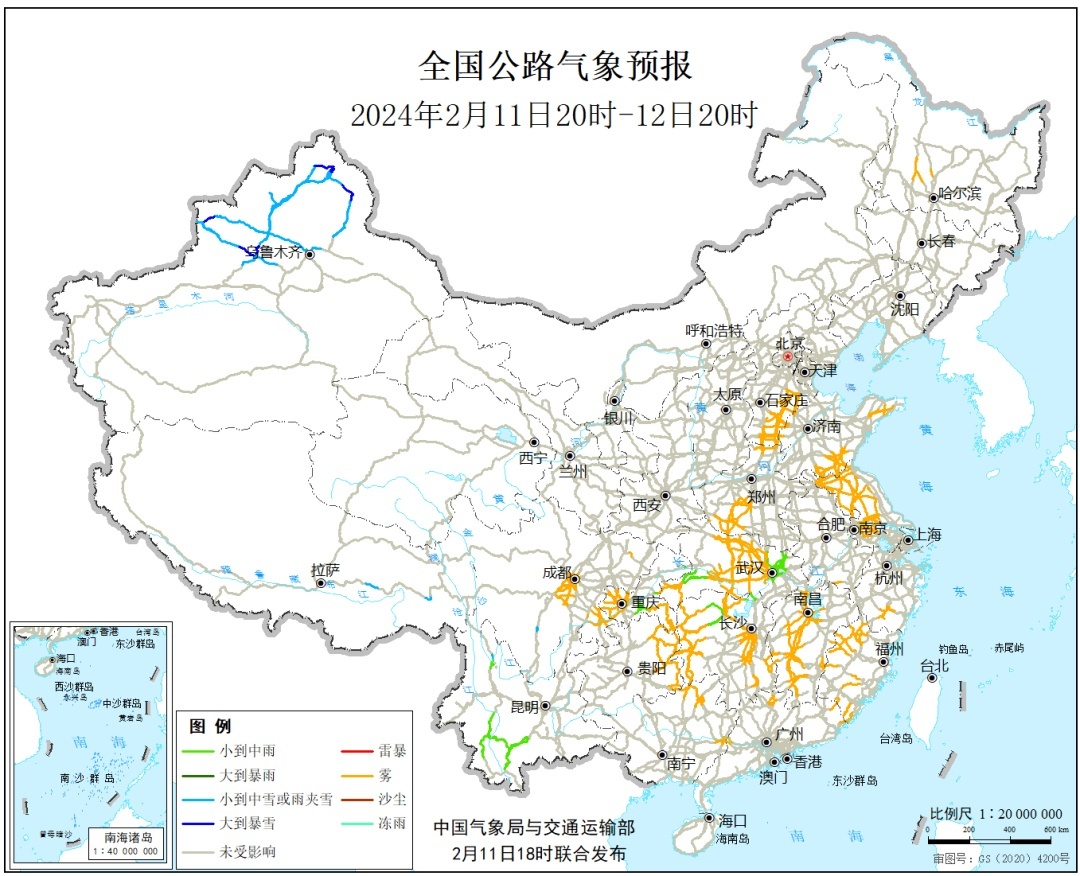 2月11日20时至12日20时,新疆北部等地部分地区有小到中雪或雨夹雪,其中,新疆北疆北部和伊犁河谷等地部分地区有大到暴雪,局地大暴雪。重庆东南部、湖北南部、湖南北部、云南中西部等地部分地区有小到中雨。另外,河北中南部、黑龙江西南部、江苏西部、浙江南部、福建西北部、江西中部、山东南部、河南南部、湖北中部、湖南西部和北部、广西北部、重庆南部、四川中部、贵州东部等地局地有雾。