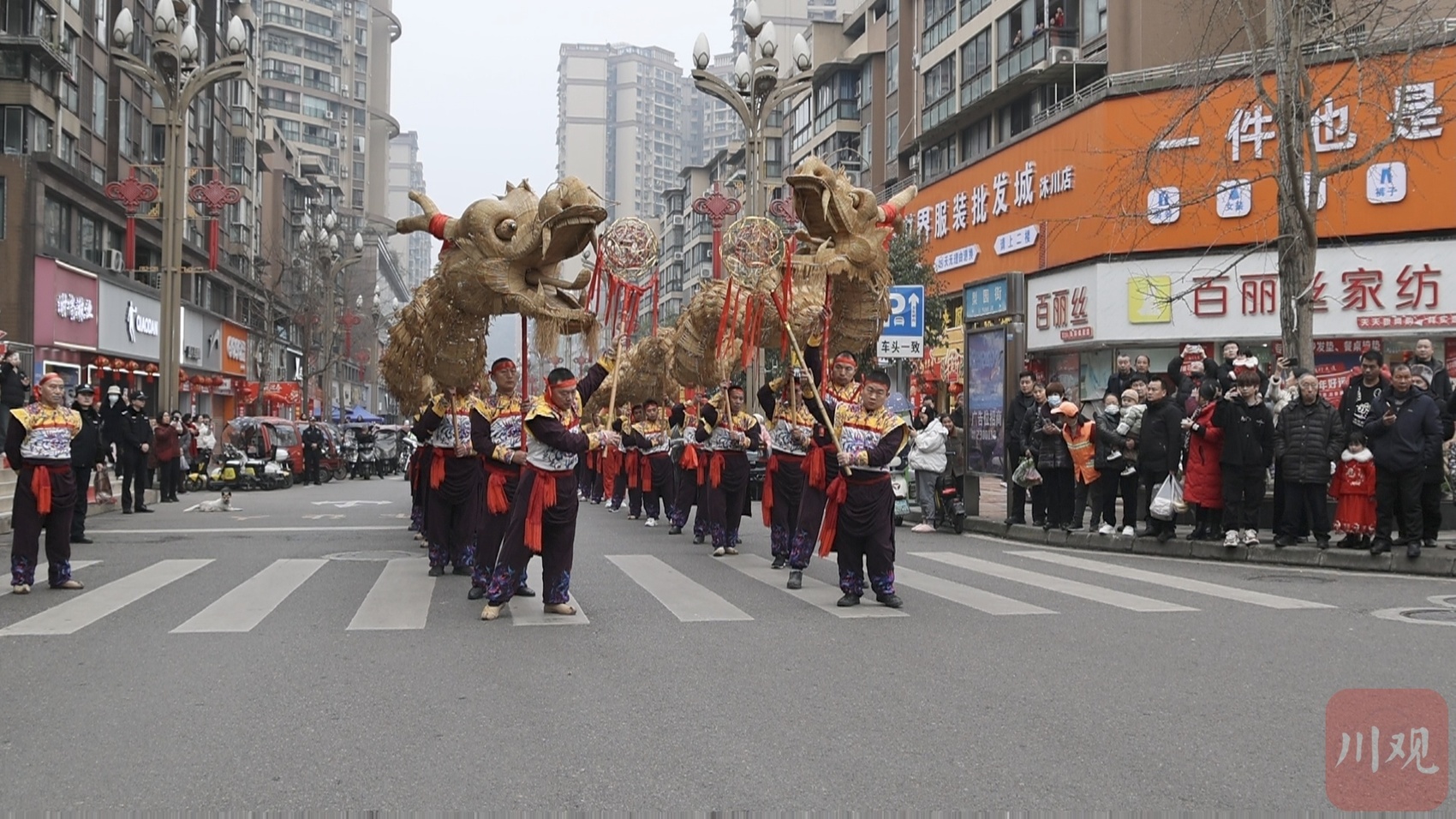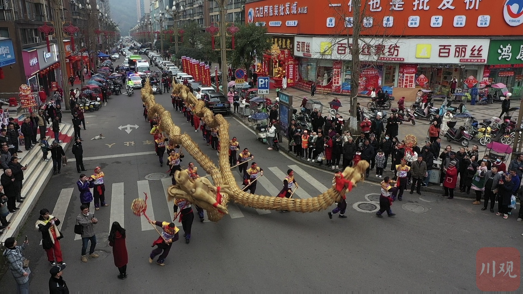 沐川县城的主干道上,两条金黄色草龙腾飞而起,吸引了众多观众的目光。