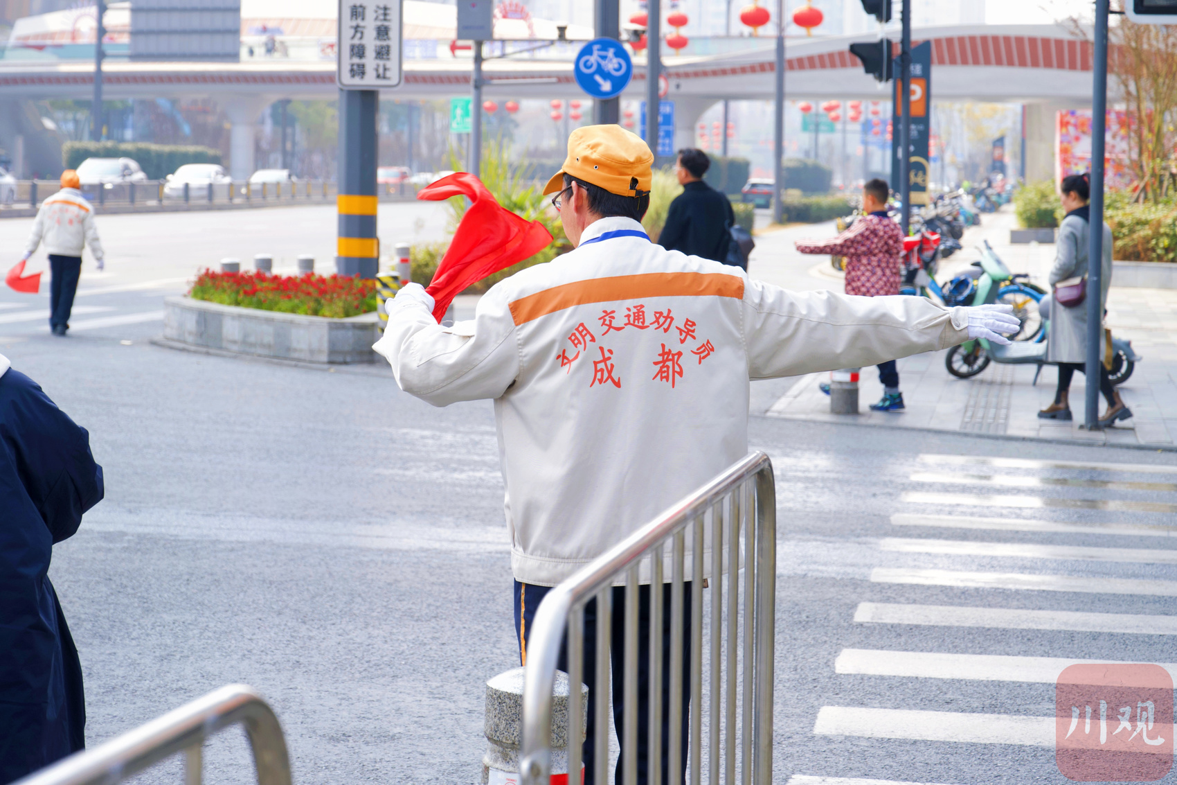 在东郊记忆入口处,坚守岗位指挥交通的劝导员