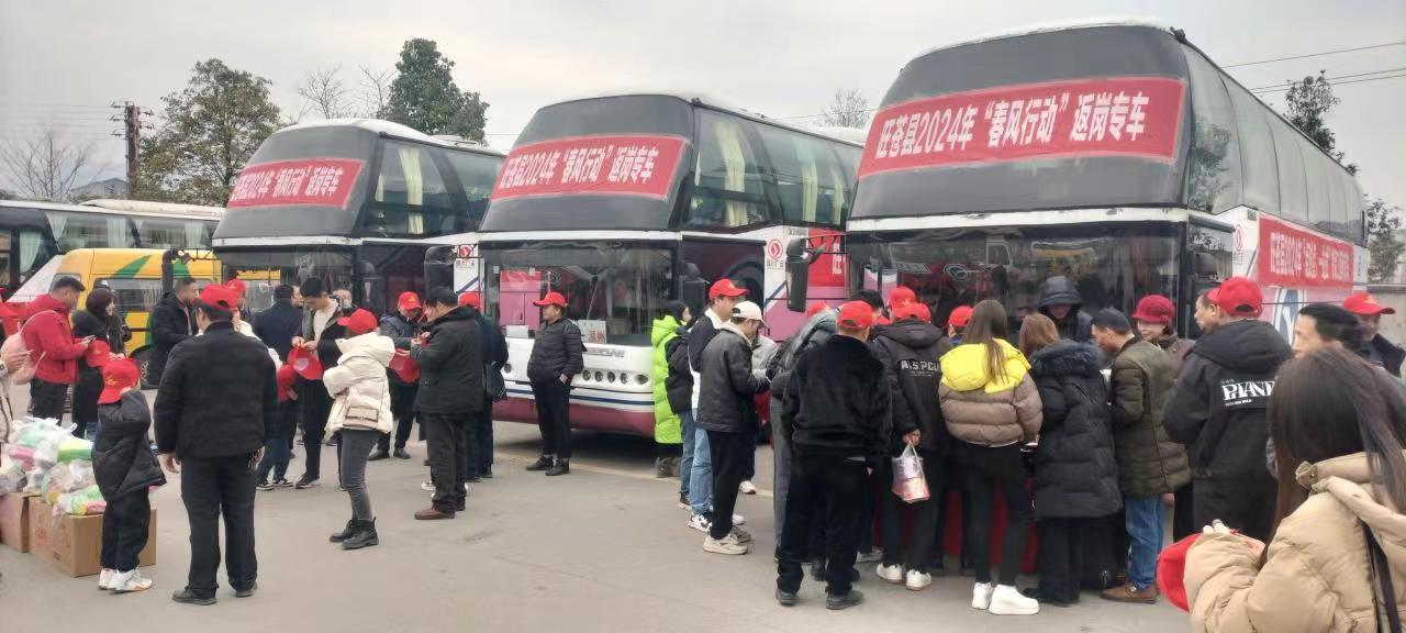 2月14日农历正月初五,上午10时许,四川省旺苍县2024年“春风行动”3辆返岗专车载着首批80余名务工人员,从旺苍前往宁波、温州、成都等地,开启新一年的务工生活。