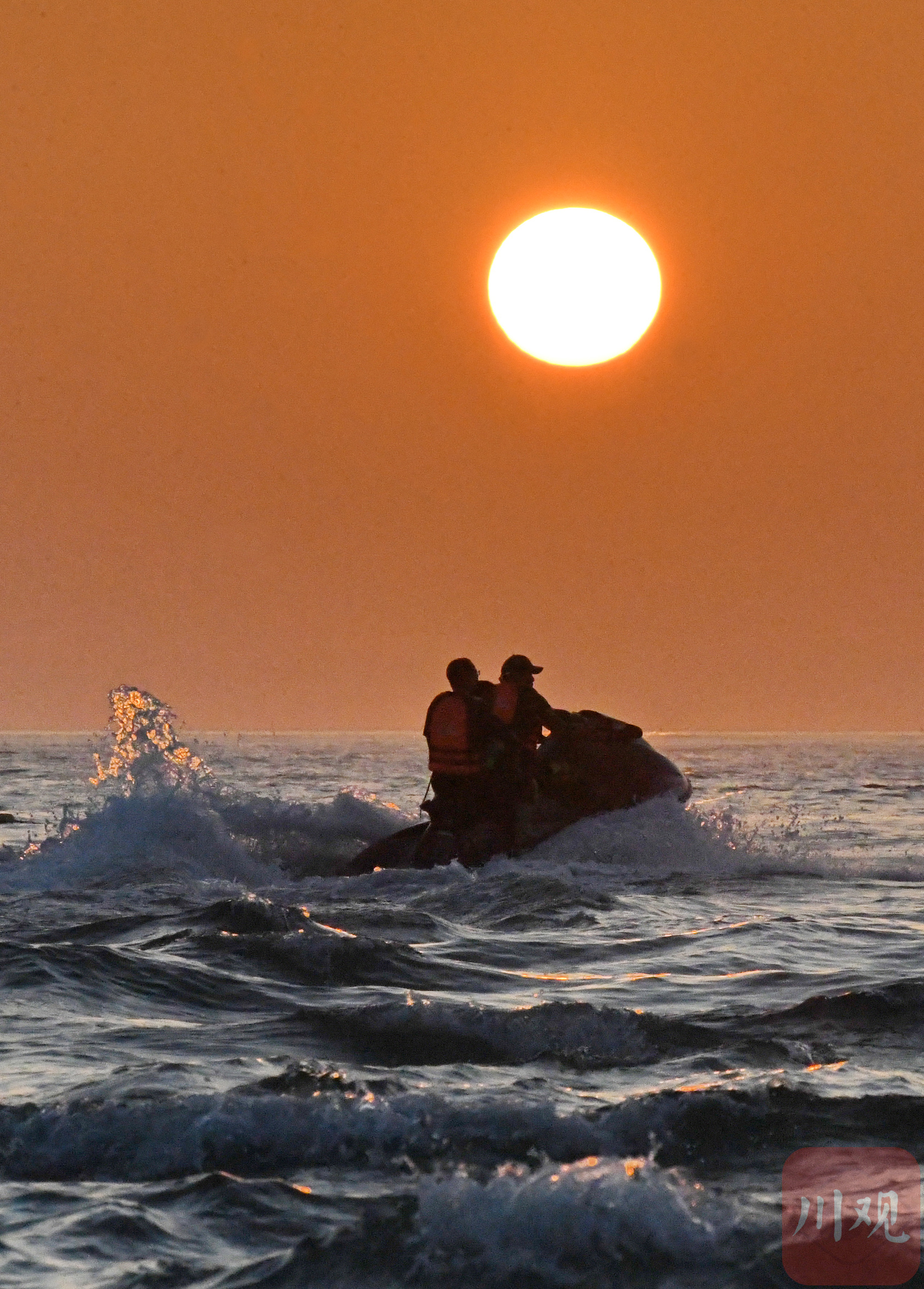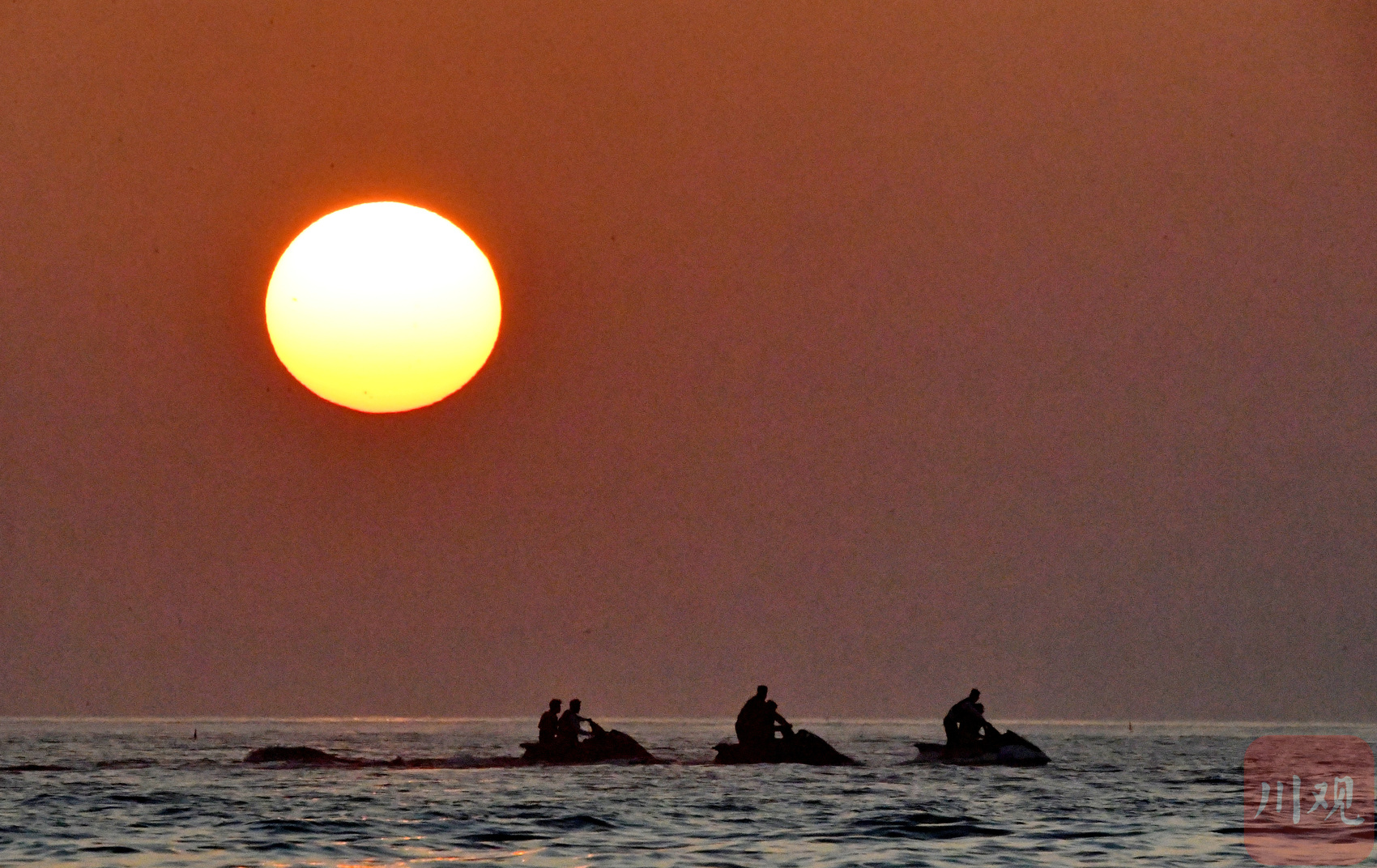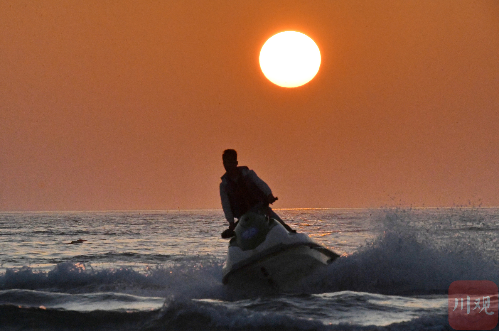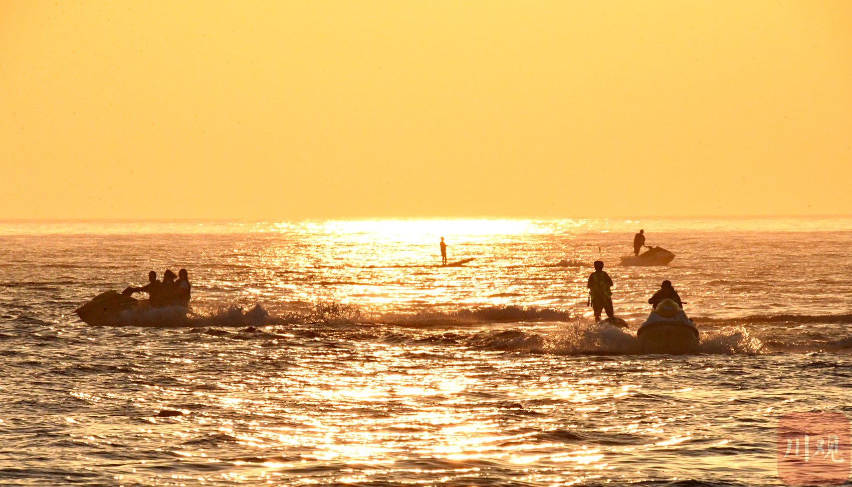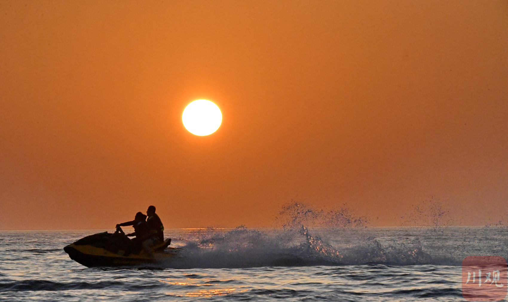 傍晚,游客在广西壮族自治区北海市涠洲岛海面体验水上游玩项目,夕阳西下美不胜收。
