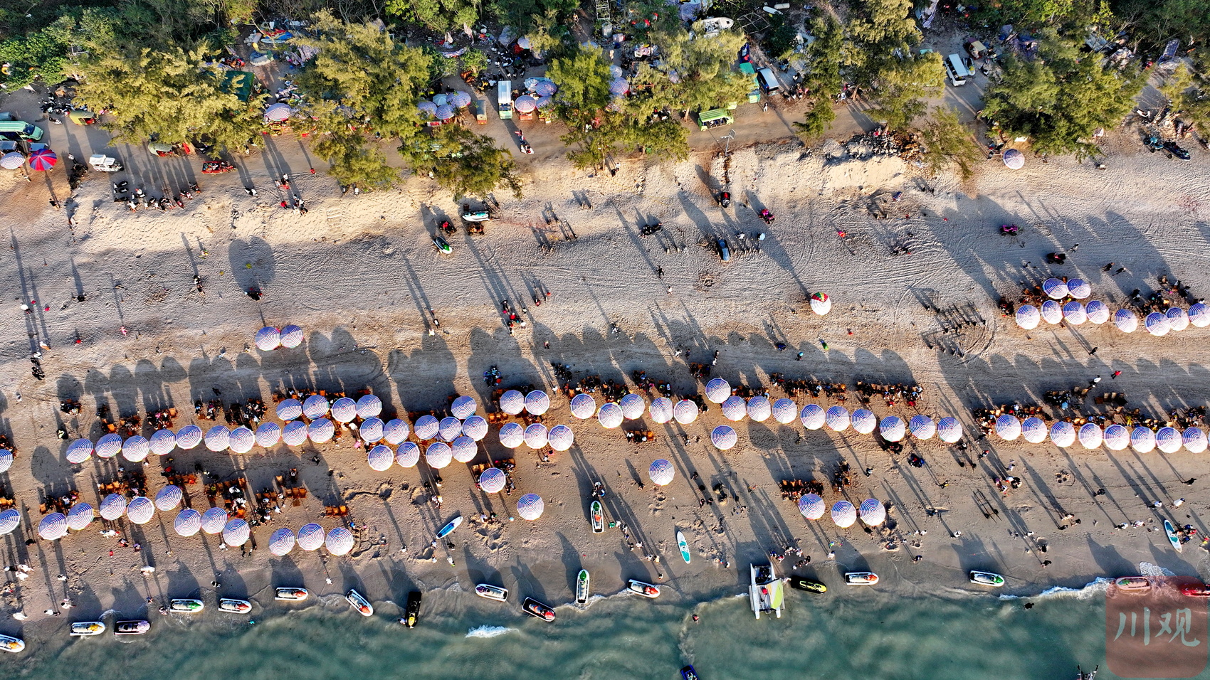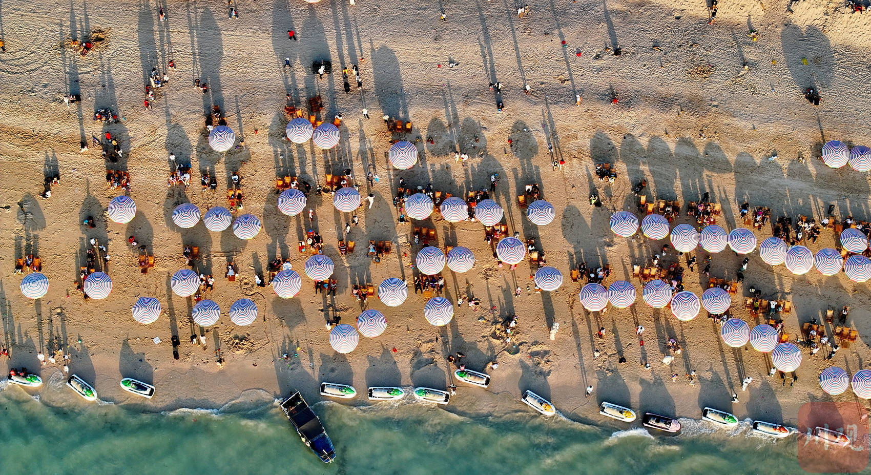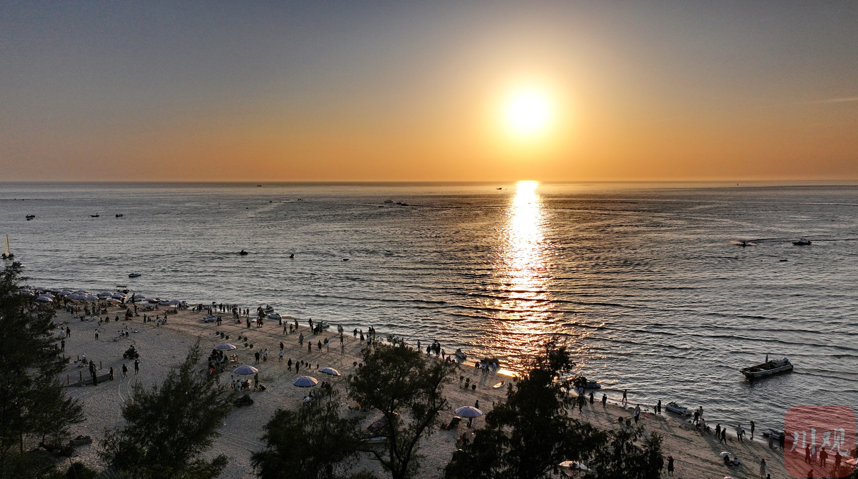 傍晚,游客在广西壮族自治区北海市涠洲岛沙滩上欣赏日落,夕阳西下美不胜收。