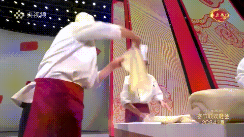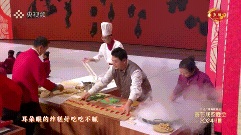 当鼓舞龙腾的舞台变身4D灶台,明火大厨正施展揉、搓、削、捏、甩等等十八般手艺,将面食鼓捣出各色形状,舞台中央的“灵魂舞者”配合上演“一面又一面”,旁边还有方言轮唱给咱下饭。锅里的水烧得正旺,屏幕前的网友看得好香……
