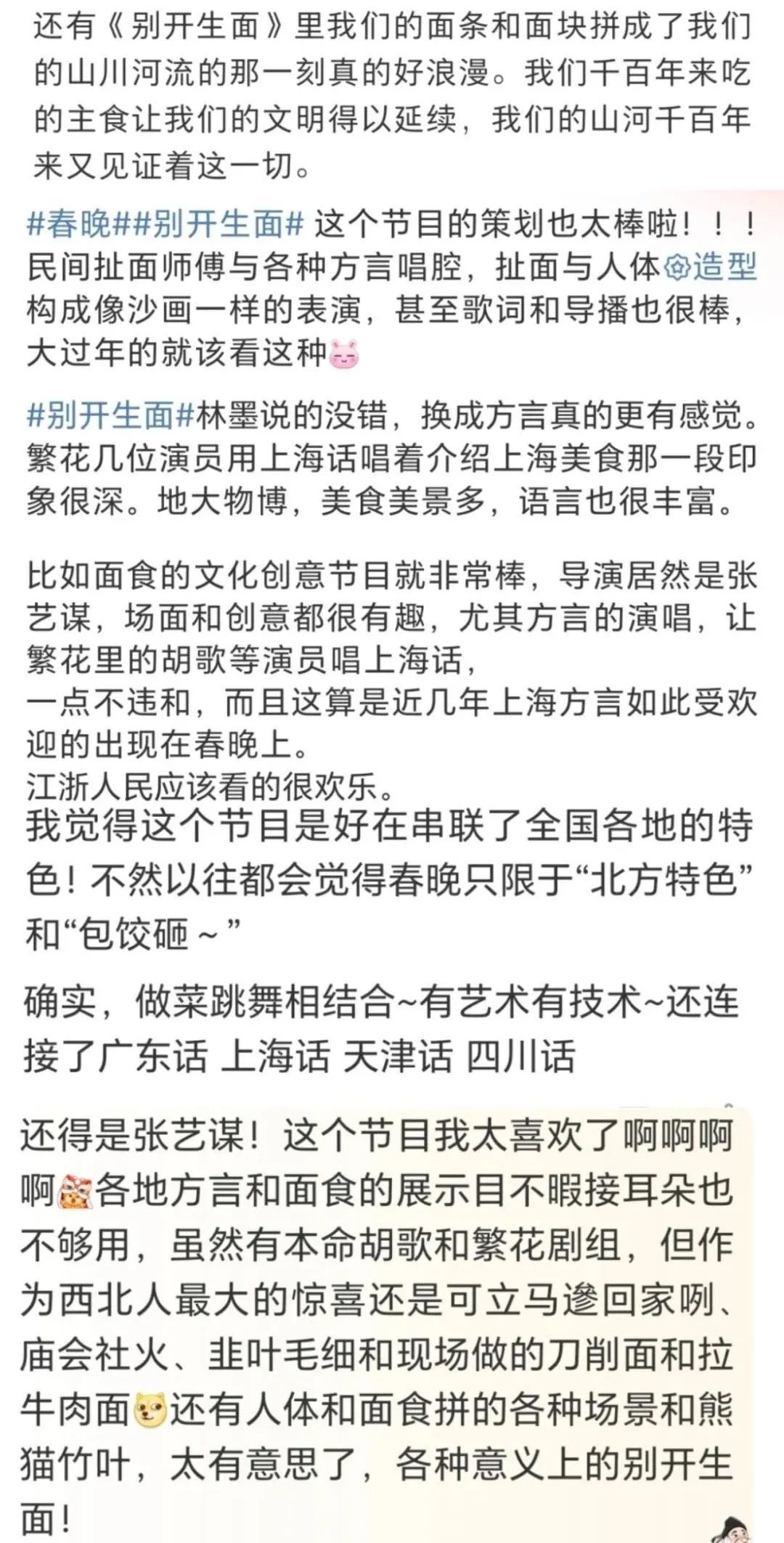 今年总台春晚里,还有一个节目名字带“面”,那就是歌曲《不如见一面》。沉浸式看春晚的网友:上半场《别开生面》看馋了,下半场《不如见一面》听哭了。年三十或许沉淀了中国人一年里最丰富的情感,在这一天直播的春晚,当然也需要为观众提供更加“多面”的情绪体验。