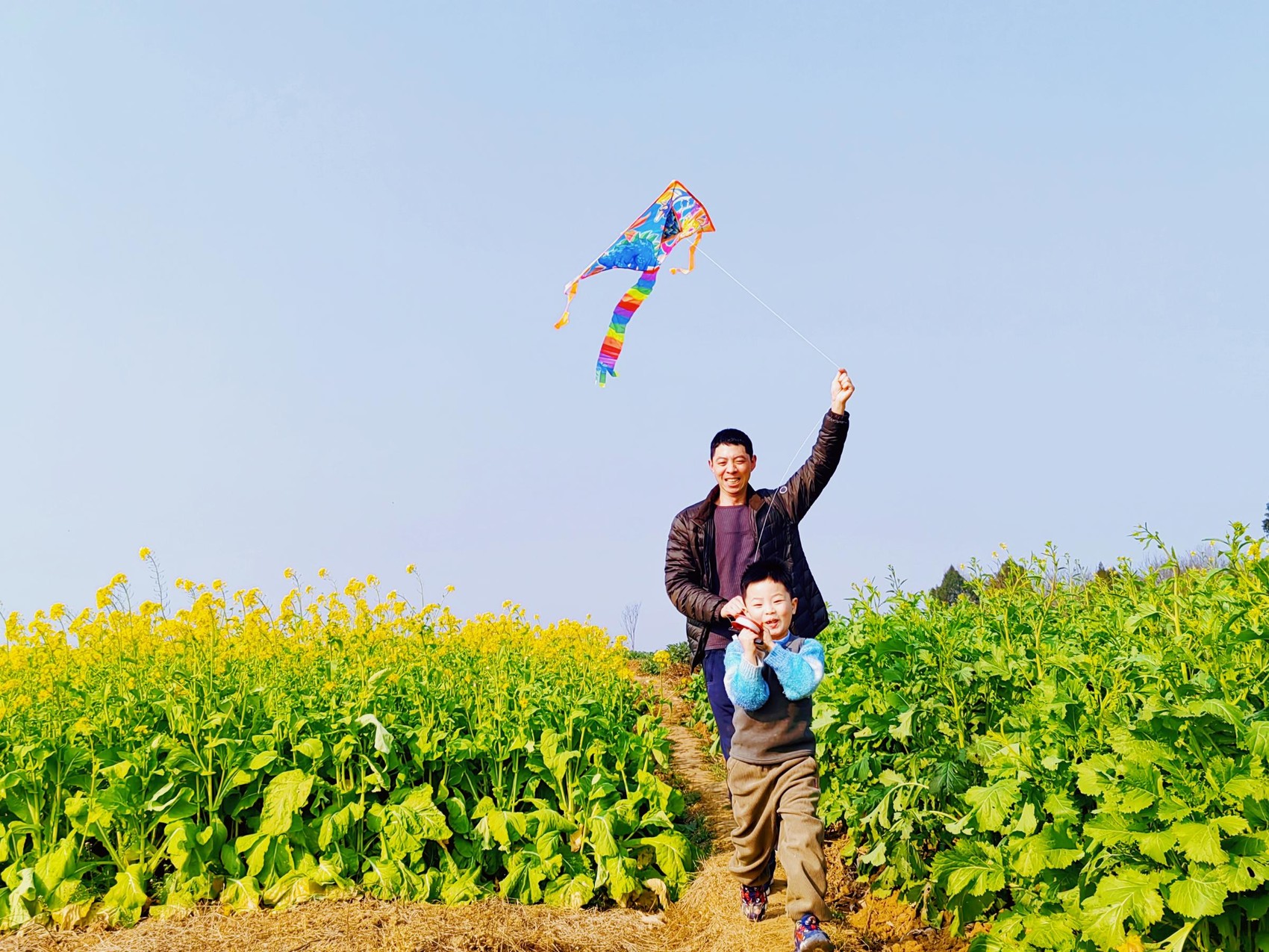 德阳网友“快乐宝贝”晒出陪孩子在油菜花田中放风筝的照片,他说,春节陪孩子放风筝的活动已经坚持了6年!