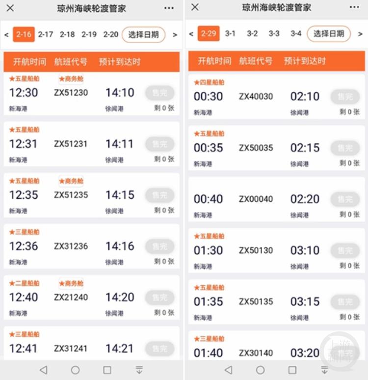粤海铁票务预订小程序显示,2月16日至3月1日,海口南港至徐闻北港小车及随车人员已经多日无票,即便有少量票,实时数据也显示,多个班次无新能源车票。