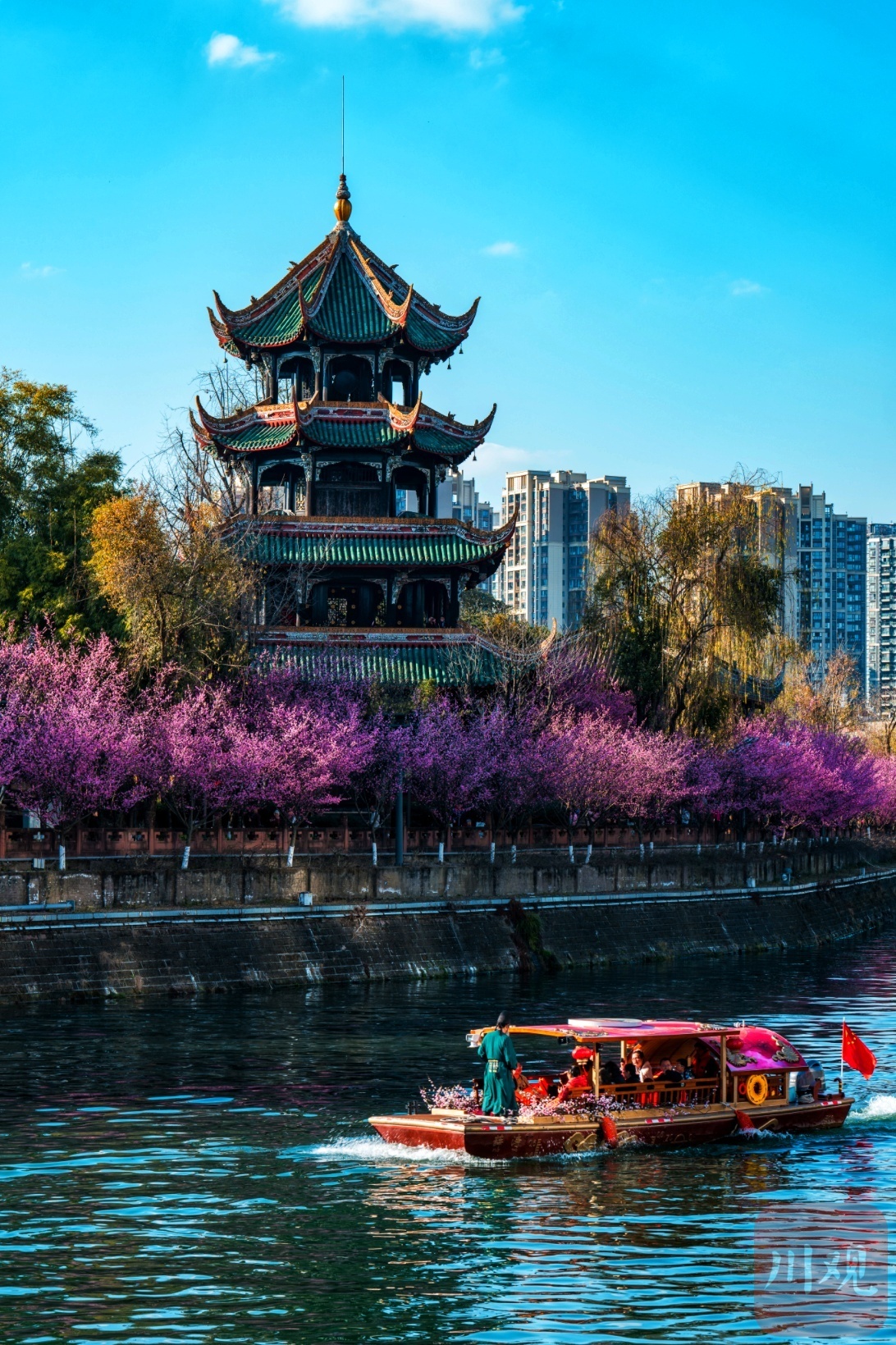 锦江杏梅红,一鸟成双影;望江楼下望江流,游轮游弋真自由;龙年春节不寻常,成都美景玩不够。