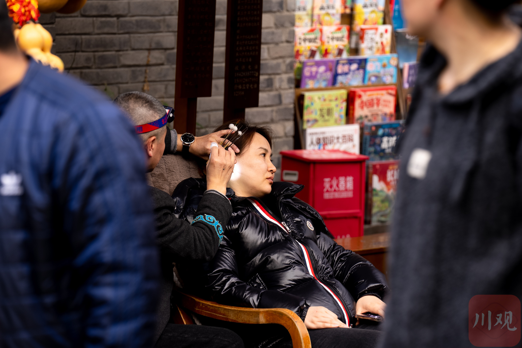 2月17日,游客在宽窄巷子体验“掏耳朵”。