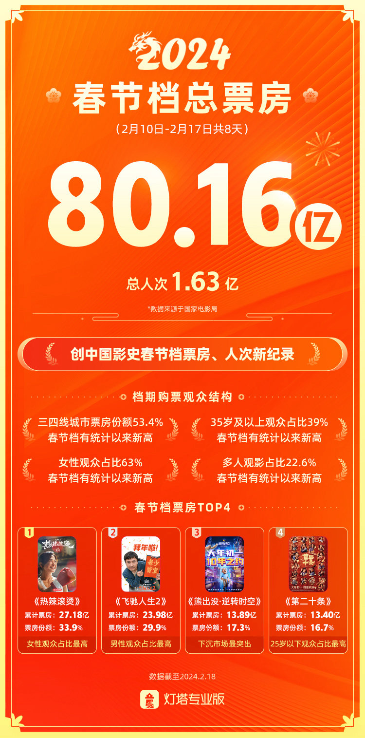 过年看片、追剧已成为新年俗。2月18日,阿里大文娱发布一组数据显示,2024年春节档娱乐消费呈现出“线上线下双增长”现象。据灯塔专业版,春节档电影总票房80.16亿元,观影人次1.63亿,均刷新中国影史春节档纪录。由阿里影业参与出品、发行的《热辣滚烫》拿下票房冠军,也是档期内女性观众占比最高的作品。而线上电影春节档也迎来丰收,优酷电影频道大屏端用户时长同比去年春节档增幅近30%。