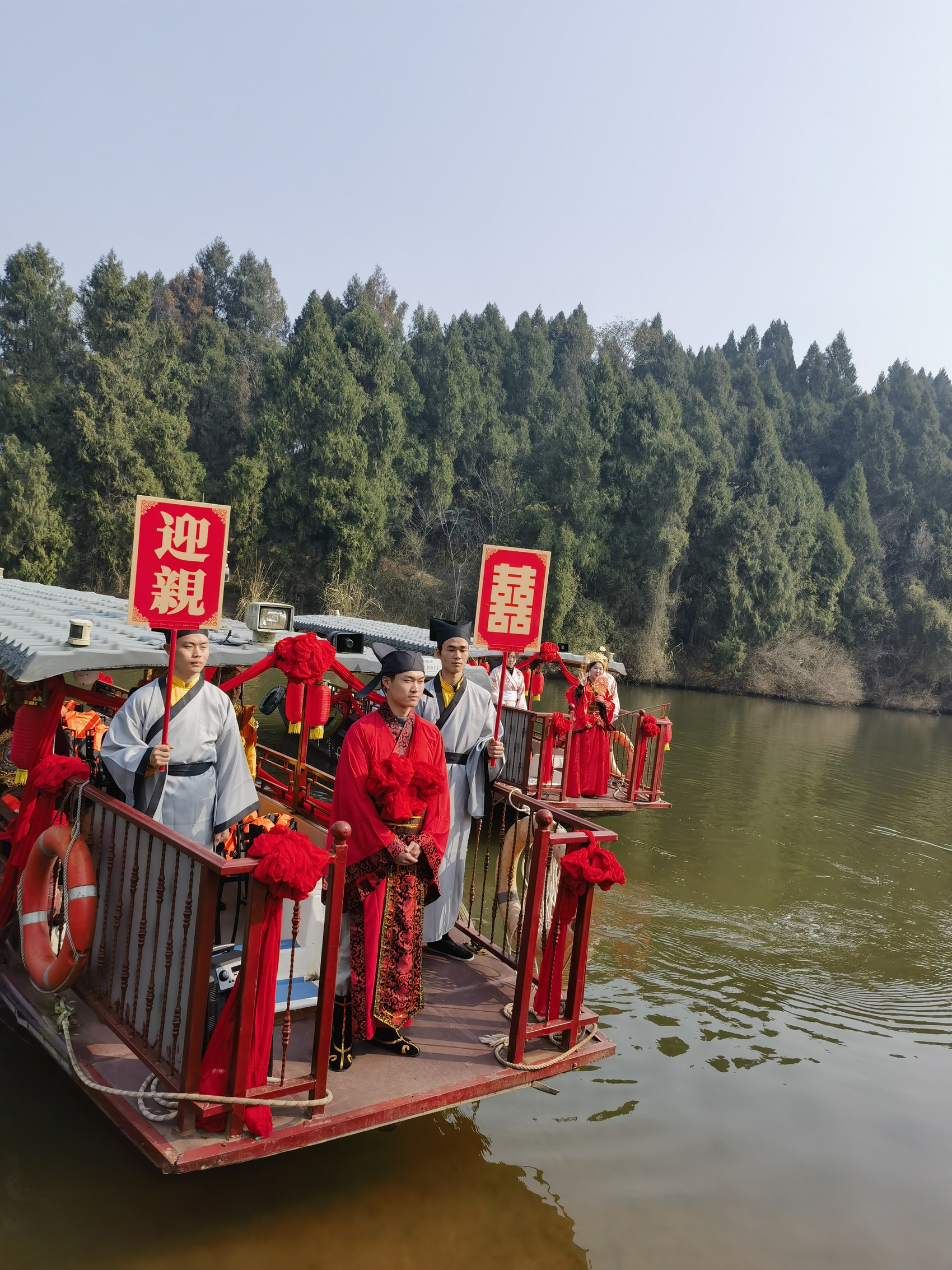 “接亲啰!”2月10日,大年初一,雁江区“天府花溪”景区,随着船夫的一声吆喝,一艘红色锦缎装扮的木船缓缓驶向开心果码头,登船、迎亲、巡游、礼拜……一场唐制水上婚礼正在进行。