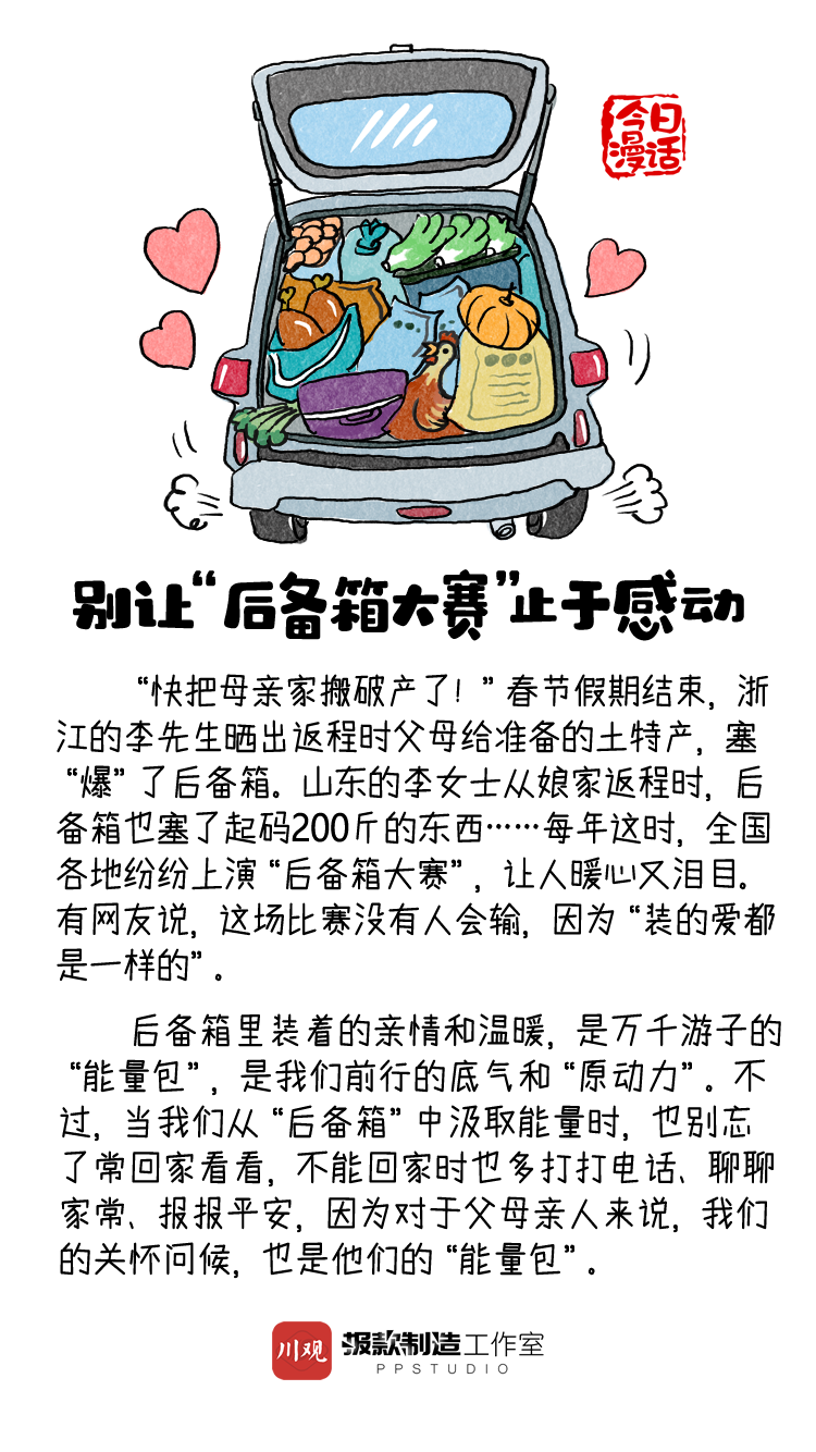 “快把母亲家搬破产了!”春节假期结束,浙江的李先生晒出返程时父母给准备的土特产,塞“爆”了后备箱。山东的李女士从娘家返程时,后备箱也塞了起码200斤的东西……每年这时,全国各地纷纷上演“后备箱大赛”,让人暖心又泪目。对此,你有什么话想说?