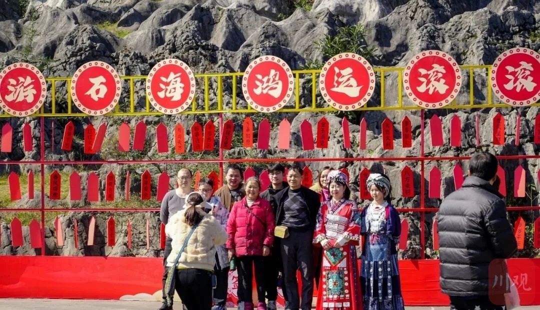 在兴文石海景区“石海涌浪”照相点,游客免费体验传统苗族服饰,感受少数民族风情;在蜀南竹海,搭配着宜宾文旅的“暖宾”好礼,景区还为游客准备了龙飞狮舞闹新春、龙王飞天送祝福、竹笛仙子水中乐、萌宠互动等趣味十足的表演,带给游客不一样的视觉体验。
