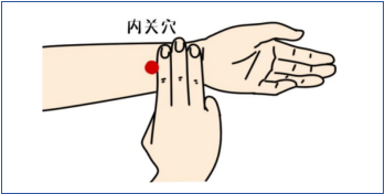 (2)内关穴:位于前臂掌侧,当曲泽与大陵的连线上,腕横纹上2寸,掌长肌腱与桡侧腕屈肌腱之间。
