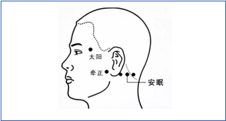 (4)安眠穴:位于后枕部,翳风穴与风池穴连线中点上。