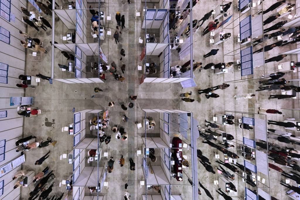 2月19日,求职者在江苏省扬州市举办的新春招聘会上寻找适合的岗位(无人机照片)。